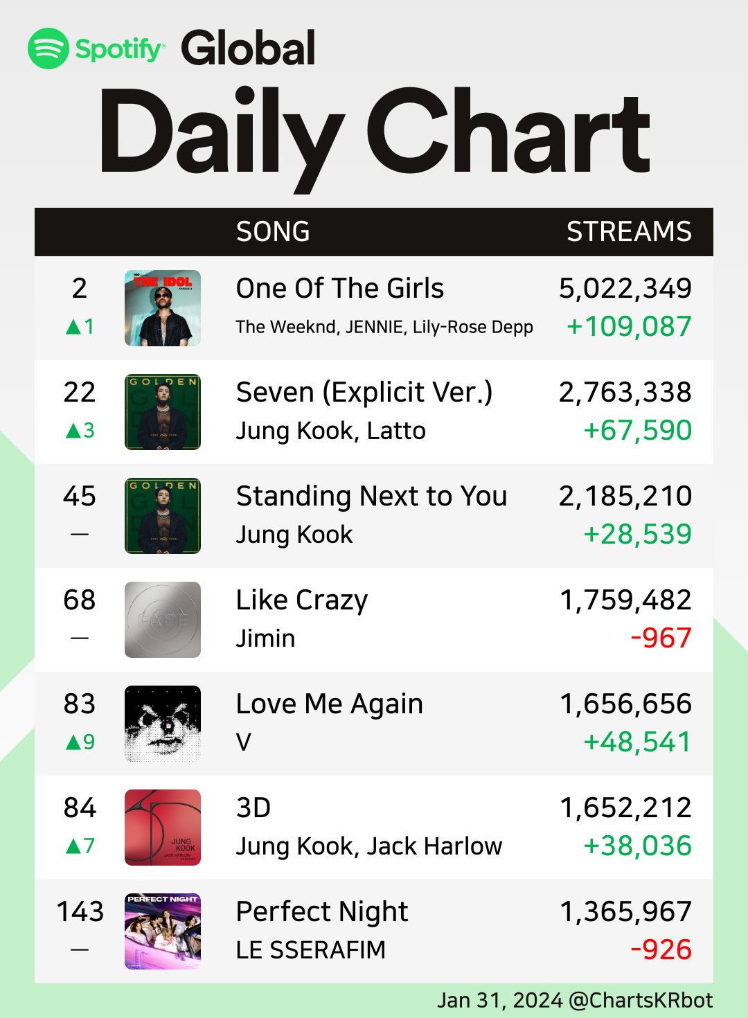 Perfect Night by LE SSERAFIM เป็นเพลงของศิลปินกลุ่ม K-POP ที่มีการ streaming เยอะที่สุด #1 บน Spotify ประจำเดือนมกราคม
