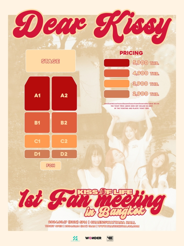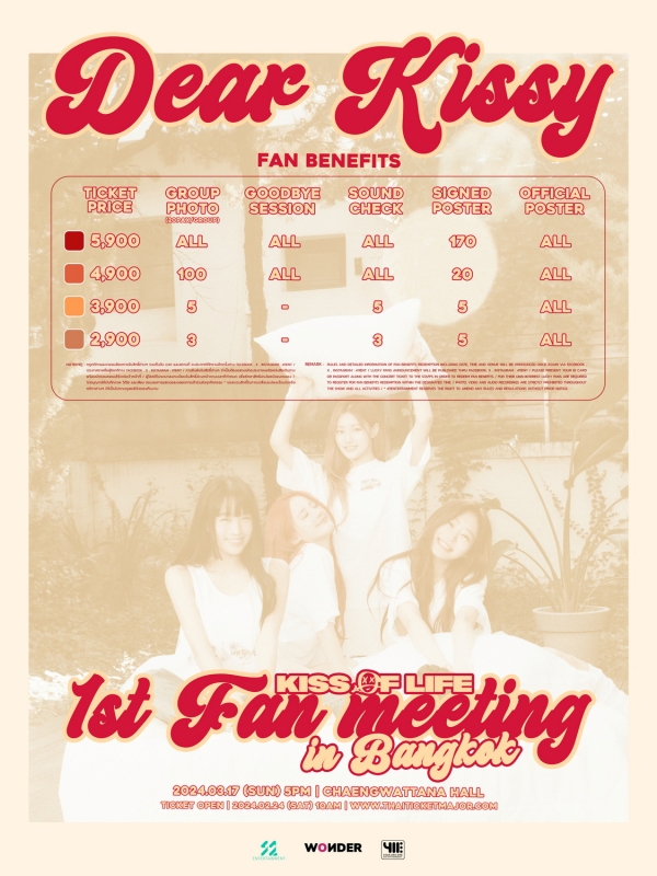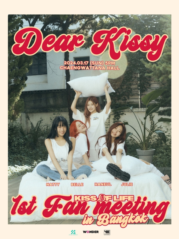 “คิสออฟไลฟ์ ‘เดียร์ คิสซี่’ เฟิร์ส แฟนมีตติ้ง อิน แบงคอก” (KISS OF LIFE ‘DEAR KISSY’ 1st Fan Meeting in Bangkok) #KISSOFLIFE_DEARKISSY_BKK วันอาทิตย์ที่ 17 มีนาคม 2567 เวลา 17:00 น. ณ แจ้งวัฒนะ ฮอลล์ ชั้น 5.5 เซ็นทรัลแจ้งวัฒนะ