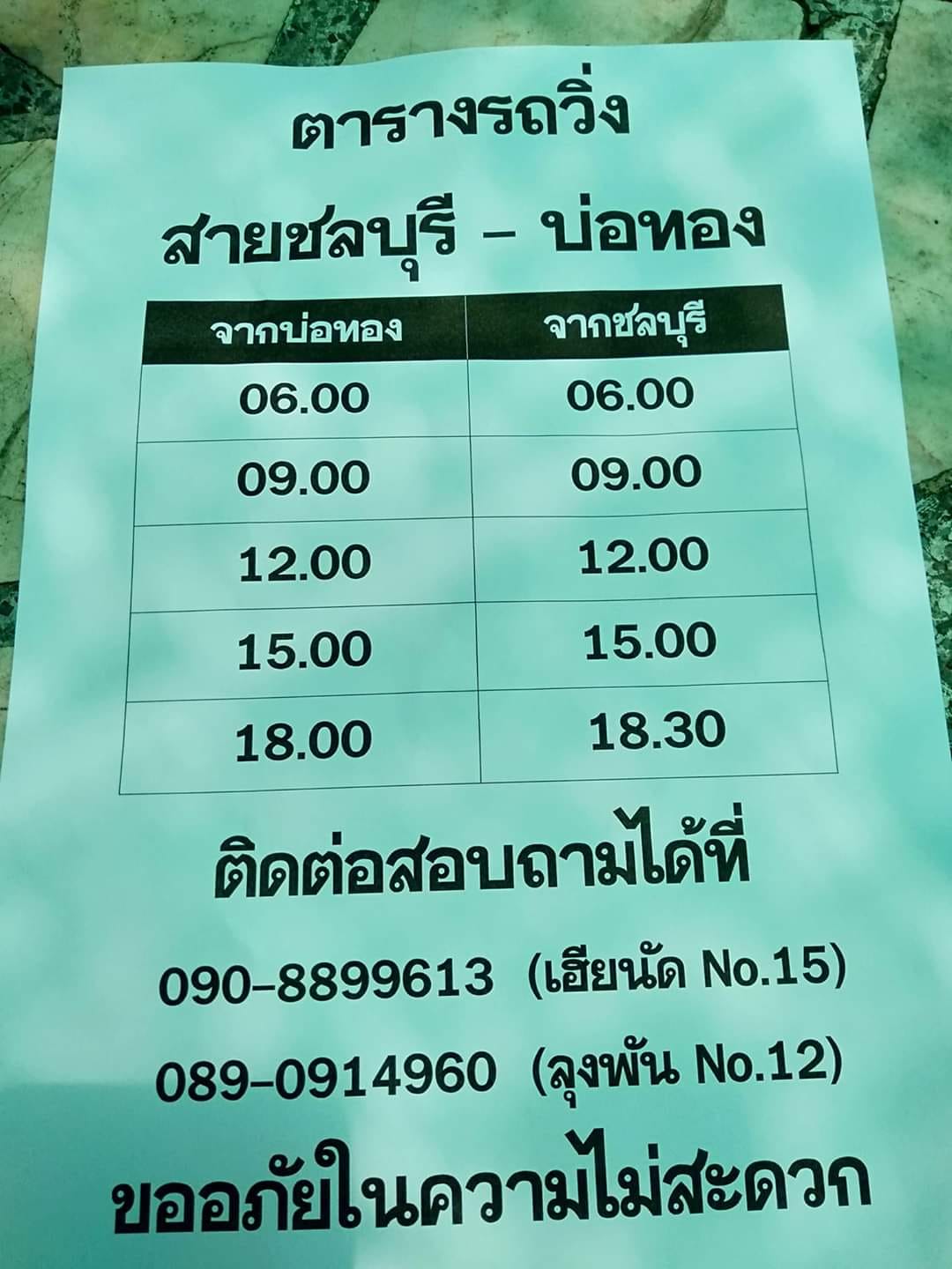 ป.ล. รถเมล์บ่อทองได้ข่าวว่าเหลือแค่คันเดียว หรืออาจไม่มีแล้วก็ได้ ดังนั้นโทรเช็คตามเบอร์นี้ก่อนครับ