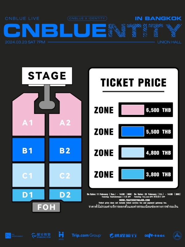 เปิดขายบัตรคอนเสิร์ต CNBLUENTITY IN BANGKOK ในวันที่ 11 ก.พ. 2567 เวลา 14.00 น. (เวลาประเทศไทย) (เวลาปักกิ่ง 15.00 น.) แฟนคลับทุกคนอย่าลืมตั้งนาฬิกากันไว้ให้พร้อม! โดยสามารถซื้อบัตรได้ผ่านช่องทาง Thaiticketmajor และ Damai APP