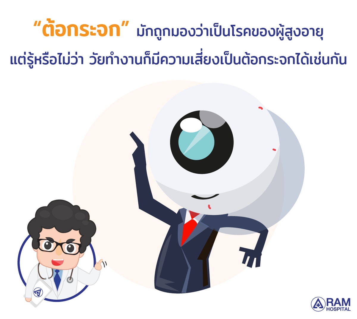 “ต้อกระจก” มักถูกมองว่าเป็นโรคของผู้สูงอายุ แต่รู้หรือไม่ว่า วัยทำงานก็มีความเสี่ยงเป็นต้อกระจกได้เช่นกัน จริงอยู่ว่า “อายุ” เป็นปัจจัยหลักที่ทำให้เกิดต้อกระจก (80% ของผู้ป่วยเป็นผู้สูงอายุ) แต่พฤติกรรมในชีวิตประจำวันของวัยทำงานก็ส่งผลต่อความเสี่ยงนี้ได้เช่นกัน โดยเฉพาะการใช้สายตาในการทำงานอยู่กับหน้าจอคอมพิวเตอร์และโทรศัพท์มือถือนานเกิน 3 ชั่วโมงต่อวัน ที่เพิ่มความเสี่ยงให้เป็นต้อกระจกก่อนวัย ถึง 2 เท่า!