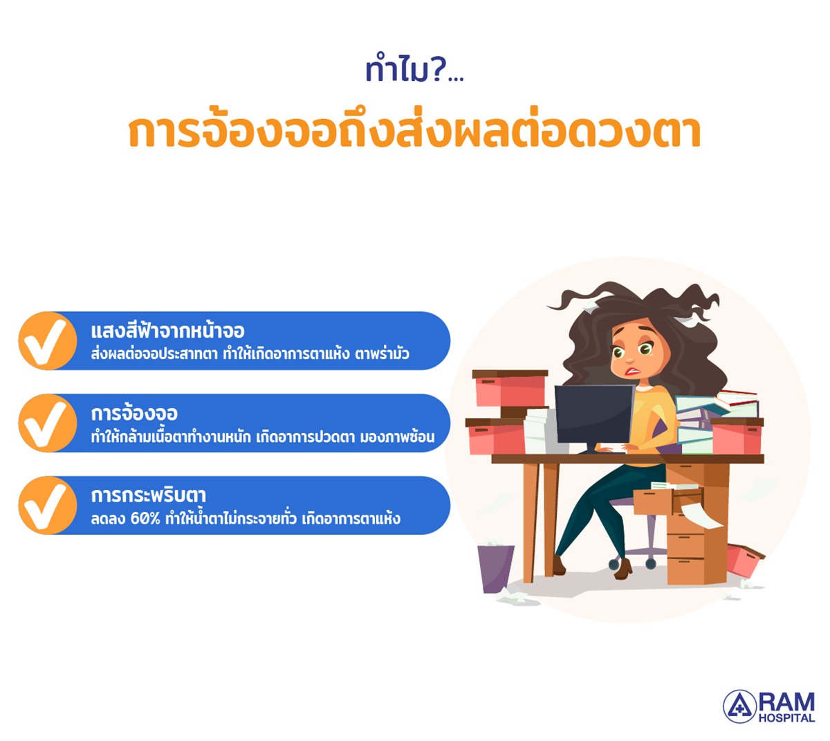 แสงสีฟ้าจากหน้าจอ : ส่งผลต่อจอประสาทตา ทำให้เกิดอาการตาแห้ง ตาพร่ามัว