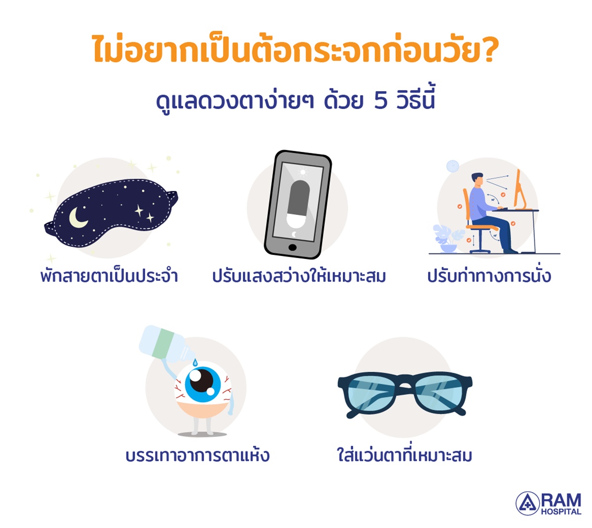 * ตรวจวัดค่าสายตาและเลือกแว่นตาที่เหมาะสม เพื่อไม่ให้ดวงตาทำงานหนักเพิ่มขึ้น