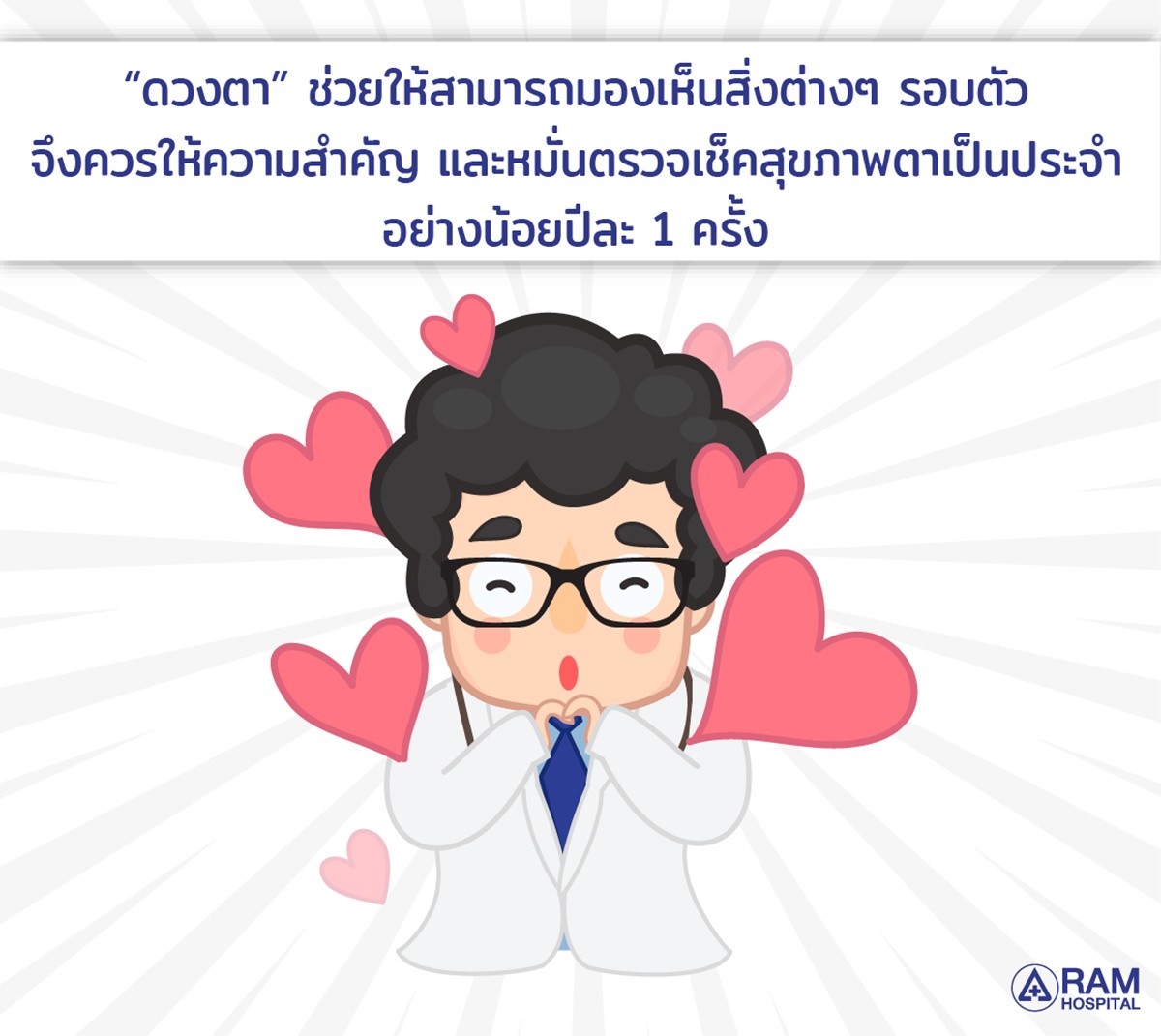 “ดวงตา” ช่วยให้เราสามารถมองเห็นสิ่งต่างๆ รอบตัวได้ การใช้ดวงตาอย่างหนักในชีวิตประจำวัน ส่งผลต่อสุขภาพตาของเราโดยตรง เราจึงควรให้ความสำคัญในการดูแล และหมั่นตรวจเช็คสุขภาพดวงตาเป็นประจำอย่างน้อยปีละ 1ครั้ง เพราะดวงตาที่เสื่อมสภาพอาจนำไปสู่โรคทางตาต่างๆ และบางโรคอาจรุนแรงถึงขั้นสูญเสียการมองเห็นแบบถาวร