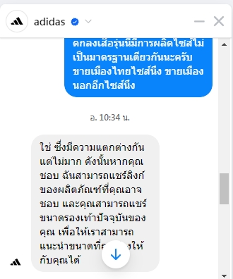 ช่วงหลังปีใหม่ ลองกดหาเล่นๆ ว่าที่ไหนมีขายไซส์ 3XL ปรากฏว่ามีขึ้นว่า adidas thailand นำไซส์ 3XL และ 4XL เข้ามาขายแล้ว ด้วยความดีใจ อยาก Third Kits เพิ่มอีกสักตัว เตรียมตัวจะสั่ง แต่เพื่อความชัวร์ลงกดดูขนาดไซส์ซะหน่อย ปรากฏว่าตารางขนาดเสื้อ ไม่ได้เหมือนกับไซส์ที่วางขายบนเว็บสโมสรหรือไซส์เสื้อแมนยูทั่วไป มีขนาดเล็กกว่าพอสมควร เลยข้อความไปถามที่เพจ adidas แต่ได้คำตอบจาก chat bot ที่ชวนปวดหัว ถามเรื่องเสื้อ ดันตอบเรื่องขนาดเท้า