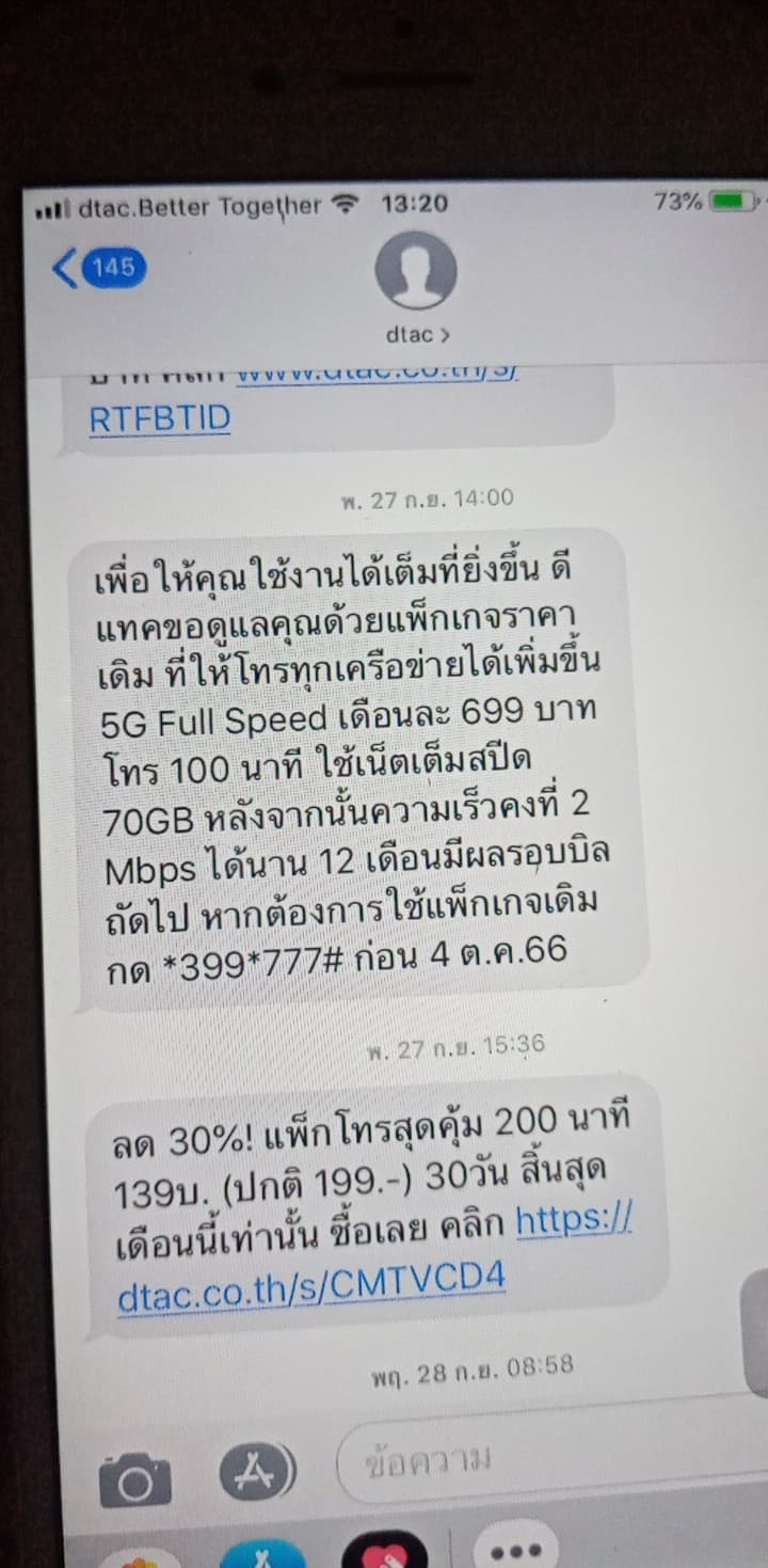 ตามนี้เลยครับ - อย่างที่เห็นในรูป คือ มันใช่เหรอครับที่บอกว่า " หากต้องการใช้แพ็กเกจเดิม กด *399*777# " - จากข้อความที่ส่งมามันรู้สึกแหม่ง ๆ มันเหมือนเป็นข้อความของพวกกลโกง มากกว่า . ลองสมมุติว่าเราไม่ได้เปิดอ่านข้อความเลย เพราะยุ่ง ๆ แบบนี้ และอยู่ดีดี ก้สมัครแพ็กเกจใหม่ให้เราโดยที่เราไม่เคยยินยอม เลย ไม่รู้เรื่องด้วยซ้ำ (ซึ่งแพ็กเกจเดิมมันก็ดีอยู่แล้ว) จะเปลี่ยนทำไม . ทำไมทางดีแทคถึงทำแบบนี้ ทำไมไม่ใช้ข้อความแบบ