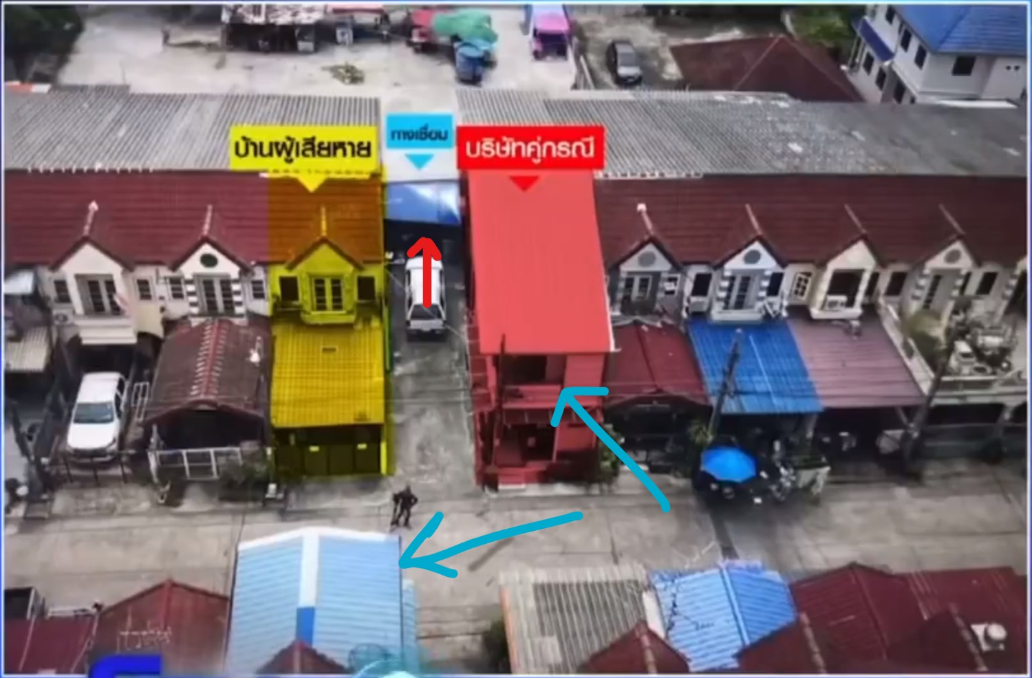 1.ลูกศรแดง ทำทางเชื่อมมีหลังคาไปบ้านที่ตัวเองบุกรุก ทั้งที่ตรงนั้นน่าจะเป็นพื้นที่ส่วนกลางสำหรับกลับรถตามกฏหมาย