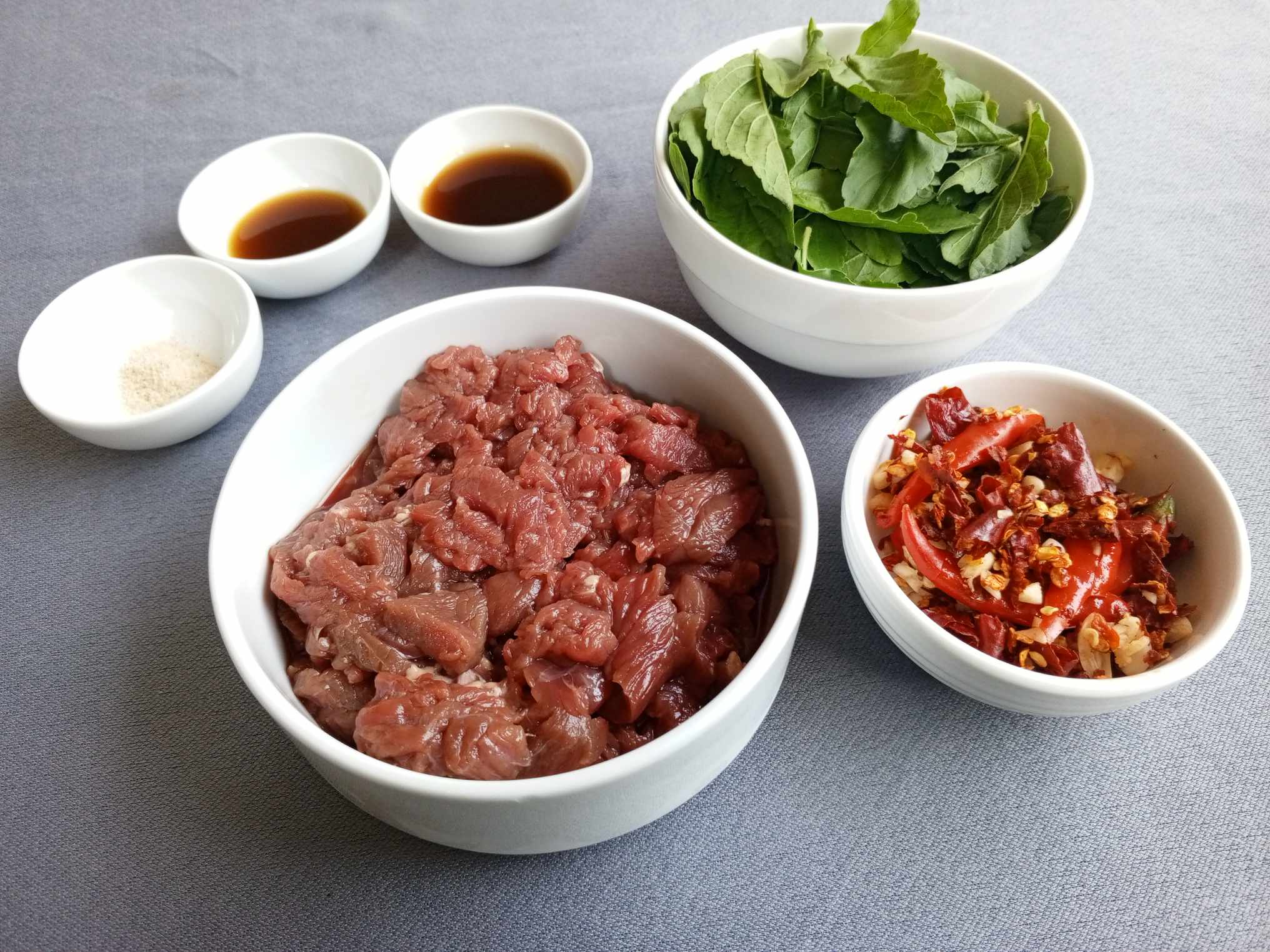 วัตถุดิบและเครื่องปรุงผัดกะเพราเนื้อ