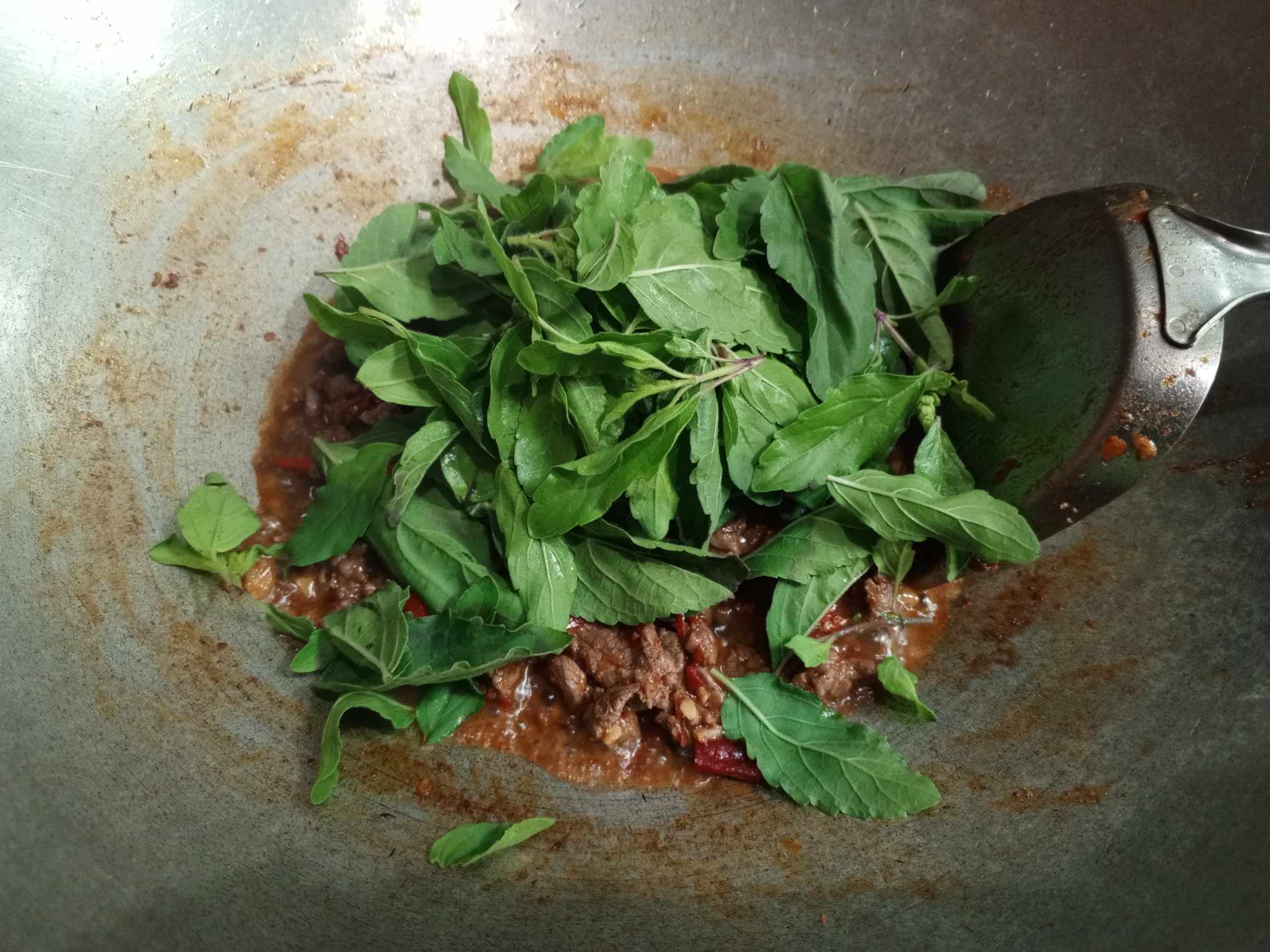 ขั้นตอนสุดท้ายใส่ใบกะเพราค่ะ