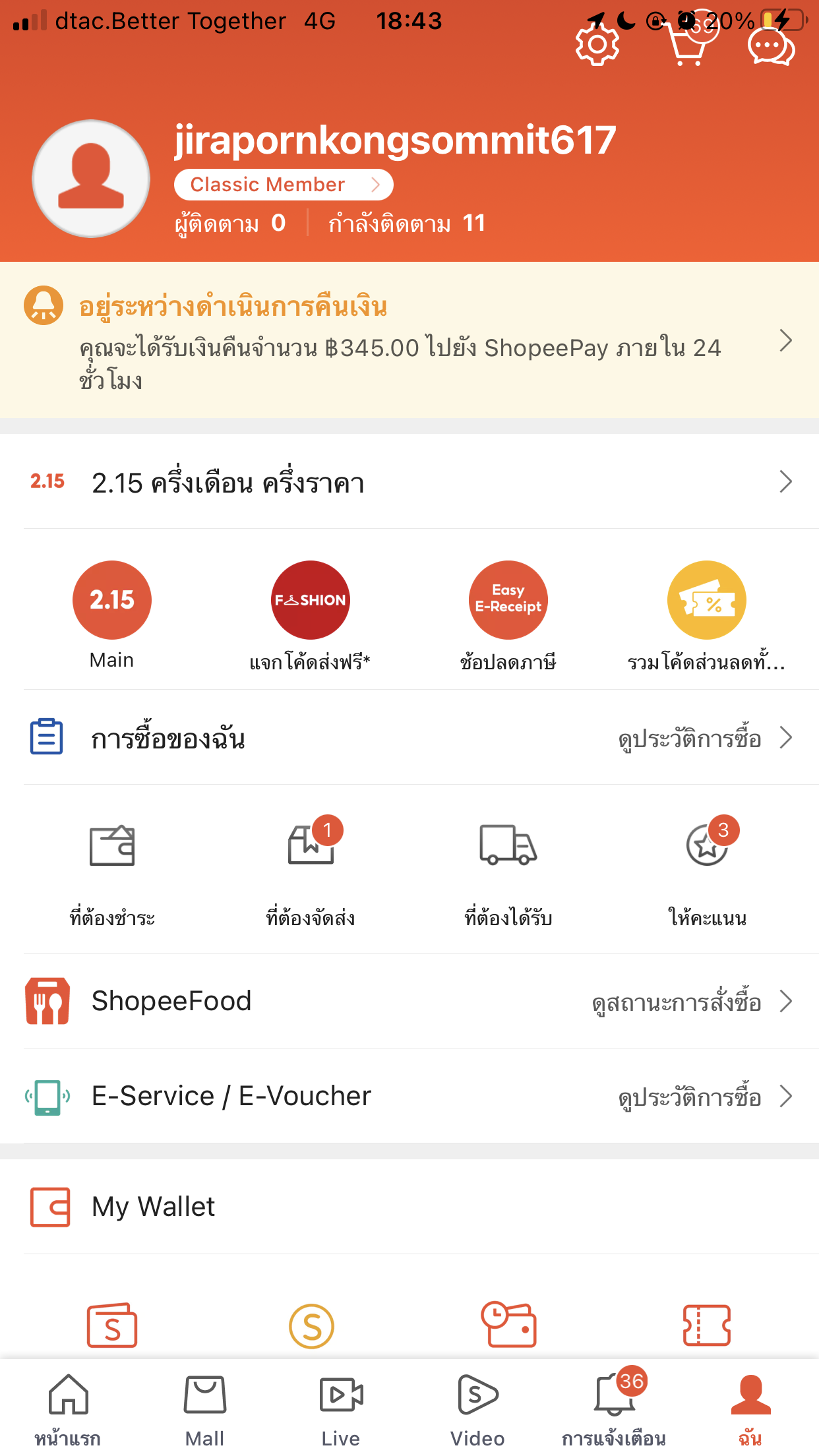 ขอคืนเงินแบบนี้จะได้เงินคืนตอนไหนหรอคะ ในช้อปปี้ เลยมา4วันแล้วค่ะ