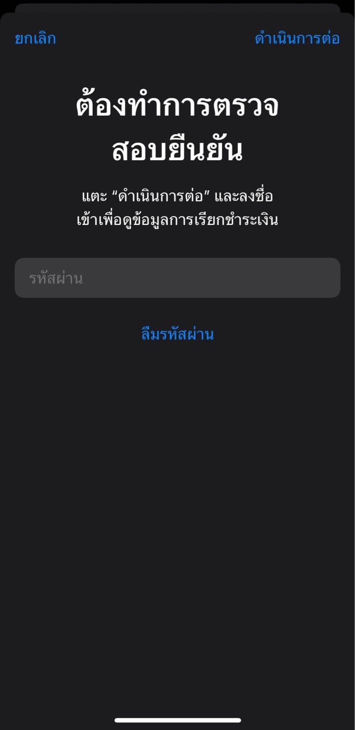 ต้องทำการตรวจ สอบยืนยัน แตะ ”ดำเนินการต่อ“ และลงชื่อ เข้าเพื่อดูข้อมูลการเรียกชำระเงิน