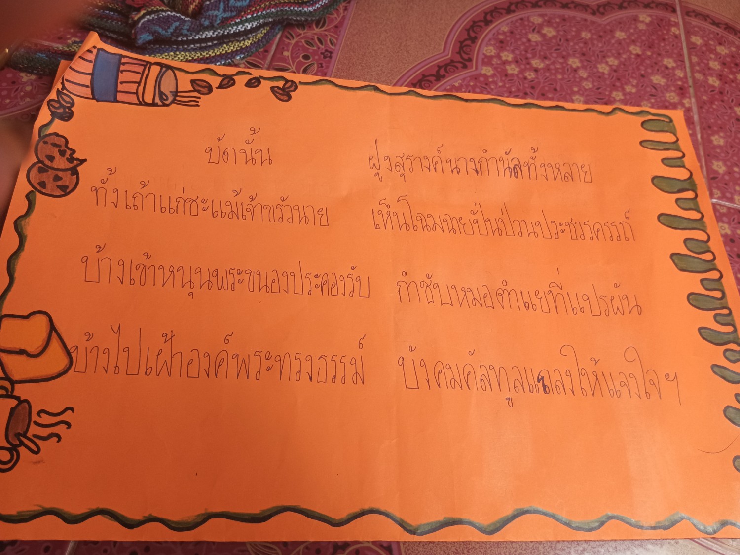 เล่มหนึ่งเทียนระเด่นบุษบา ปักลงตรงหน้านวลหง เล่มหนึ่งเทียนอิเหนาสุริย์วงศ์ ปักลงเบื้องขวาเทวี เล่มหนึ่งเทียนท้าวจรกา อยู่เบื้องซ้ายบุษบามารศรี เทียนทองทั้งสองเล่มนี้ ขอจงเป็นที่เสี่ยงทาย