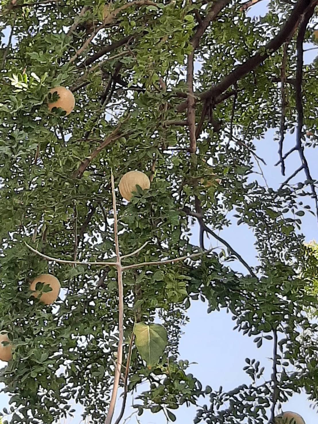 เดินผ่านแล้วให้สงสัย ต้นอะไรหว่า สูงใหญ่ ลูกเหมือนมะพร้าวเผา ถามพี่วินมอเตอร์ไซค์ เขาบอกว่า คือต้นมะขวิด ลูกกลมๆ ที่เห็น ก็เป็นลูกมะขวิด ที่ต้องรอมันสุกก่อนถึงจะกินได้