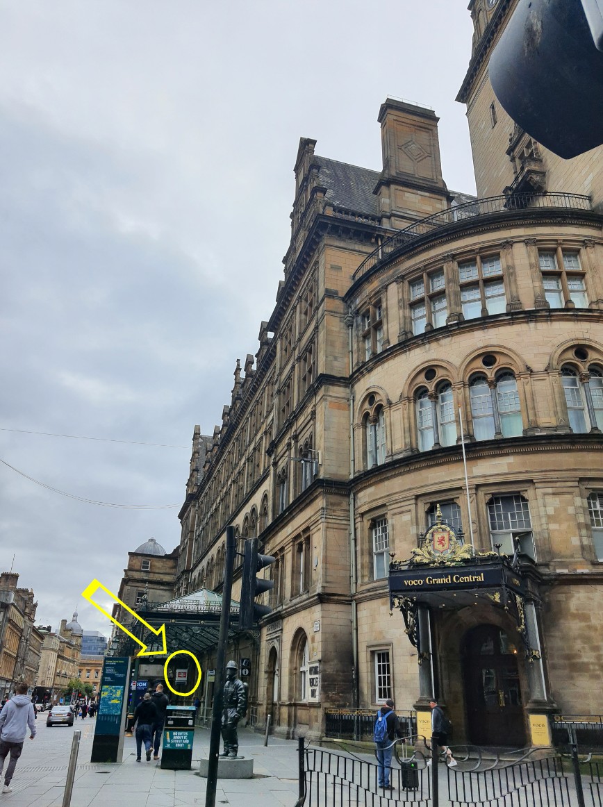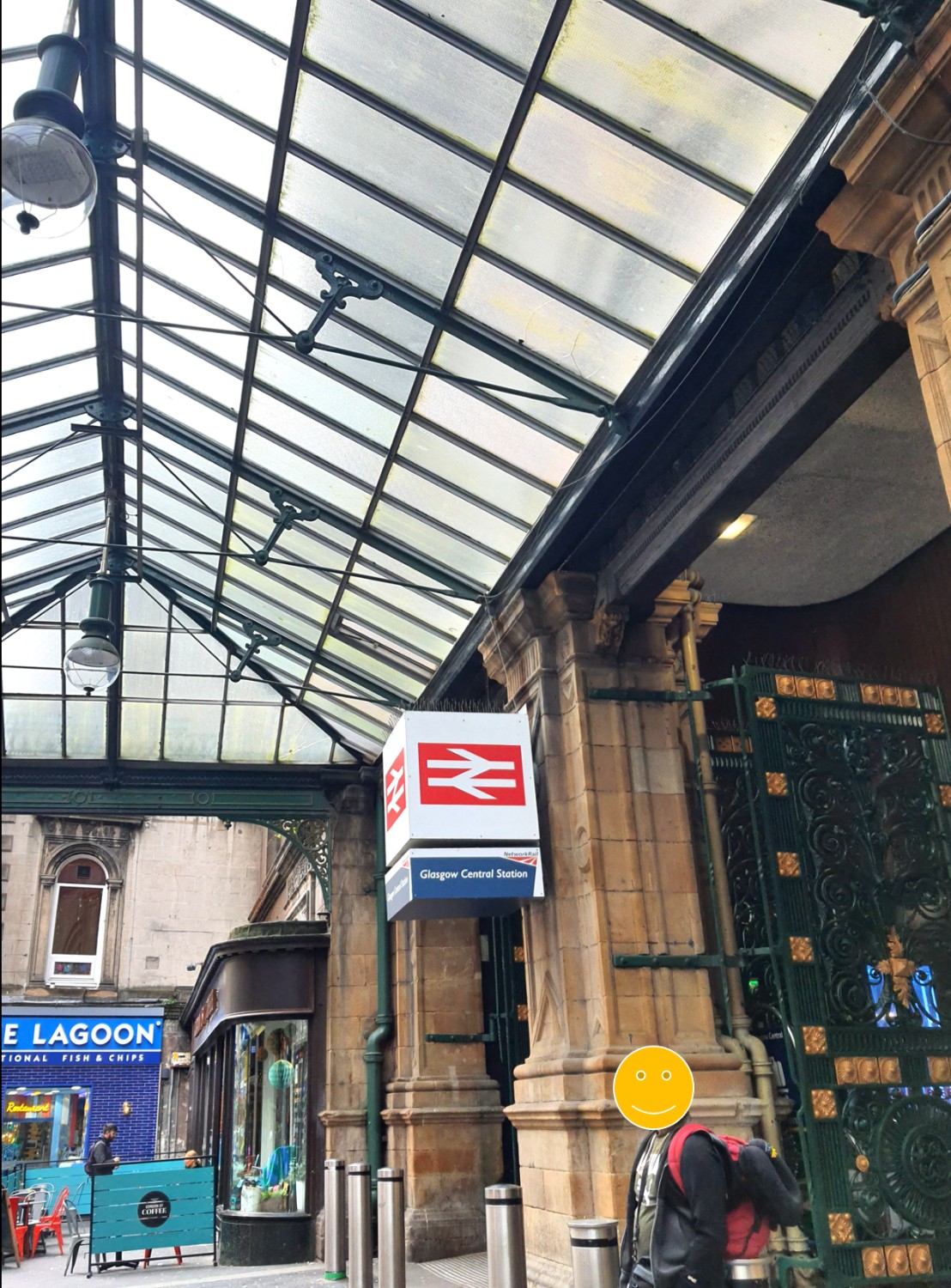 เราบินตรงจากประเทศไทยลงสนามบิน Glasgow และเมื่อผ่าน ตม. ออกมาแล้ว เราเดินทางเข้าเมืองโดยนั่ง airport shuttle (First Bus 500) ซี่งมาทุก 10-15 นาที ซึ่งเราสามารถเลือกซื้อว่าจะเป็นขาเดียวหรือไปกลับภายในกี่วันมีหลายตัวเลือกค่ะ และสามารถซื้อ online หรือตอนเข้าแถวขึ้นรถจะมีคุณพนักงานมาตรวจบัตรพร้อมขายบัตรตรงนั้นด้วยซื้อตรงนั้นได้เลยค่ะ โดย bus นี้จะจอดหลายสถานีหลักอยู่ค่ะ เช่น Bothwell Street, Hope Street, George Square, North Hanover Station, Buchanan Bus Station โดยเราจะไปต่อรถไฟที่ central station ก็ลง bus ที่ Hope Street ค่ะ มองเข้าไปจะเห็นสัญลักษณ์ของ train station (ที่วงสีเหลืองไว้)