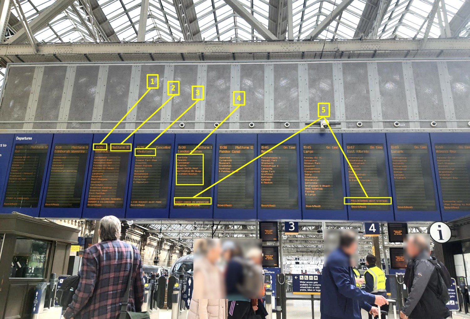 หมายเลข 2 คือ ชานชาลาที่รถไฟมาจอดที่ station นี้ ซึ่งบางทีจะเห็นว่า ยกเลิก (cancelled) ไปก็มีค่ะ