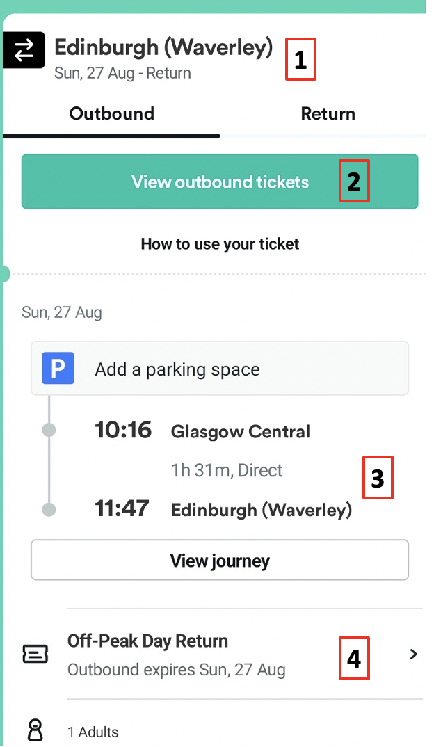 นอกจากนี้เราสามารถใช้ train app จองการเดินทางระหว่างเมืองได้ด้วยค่ะ โดยเราจองจาก Glasgow ไป Edinburgh พอเลือกเวลาและจ่ายตังค์เสร็จก็จะขึ้นมาประมาณนี้ค่ะ