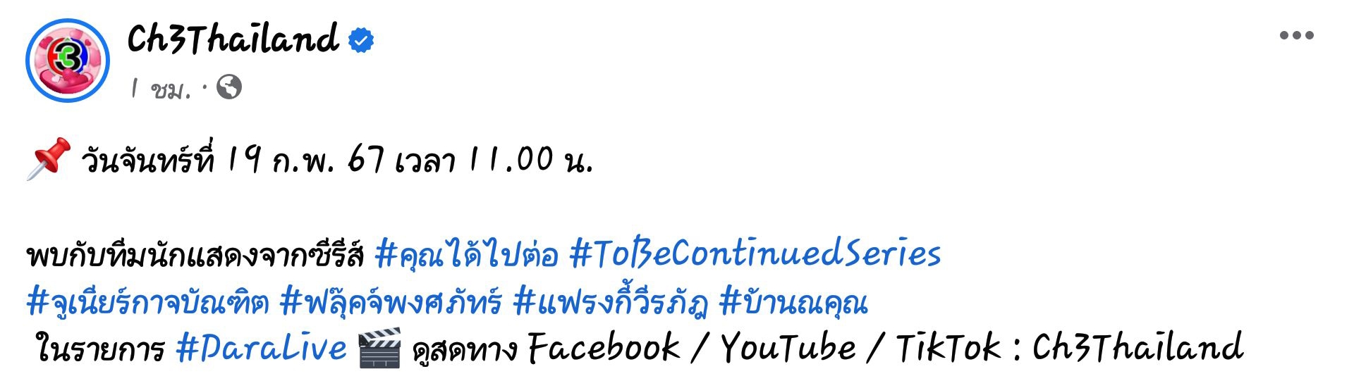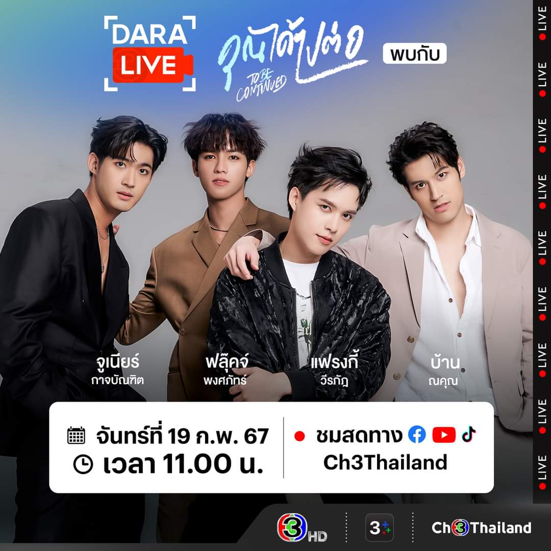 🧐 #DaraLive 🔴 วันจันทร์ ที่ 19 ก.พ. 67 เวลา 11.00 น. พบกับนักแสดงจากซีรีส์ #คุณได้ไปต่อ #ToBeContinuedSeries 🤗