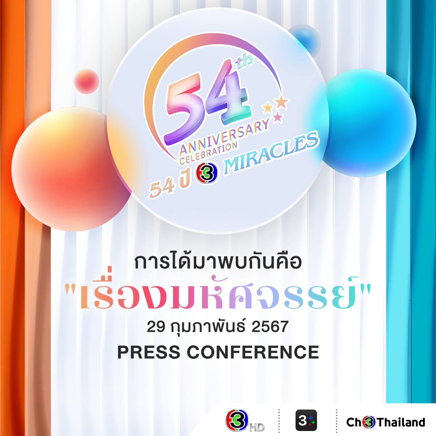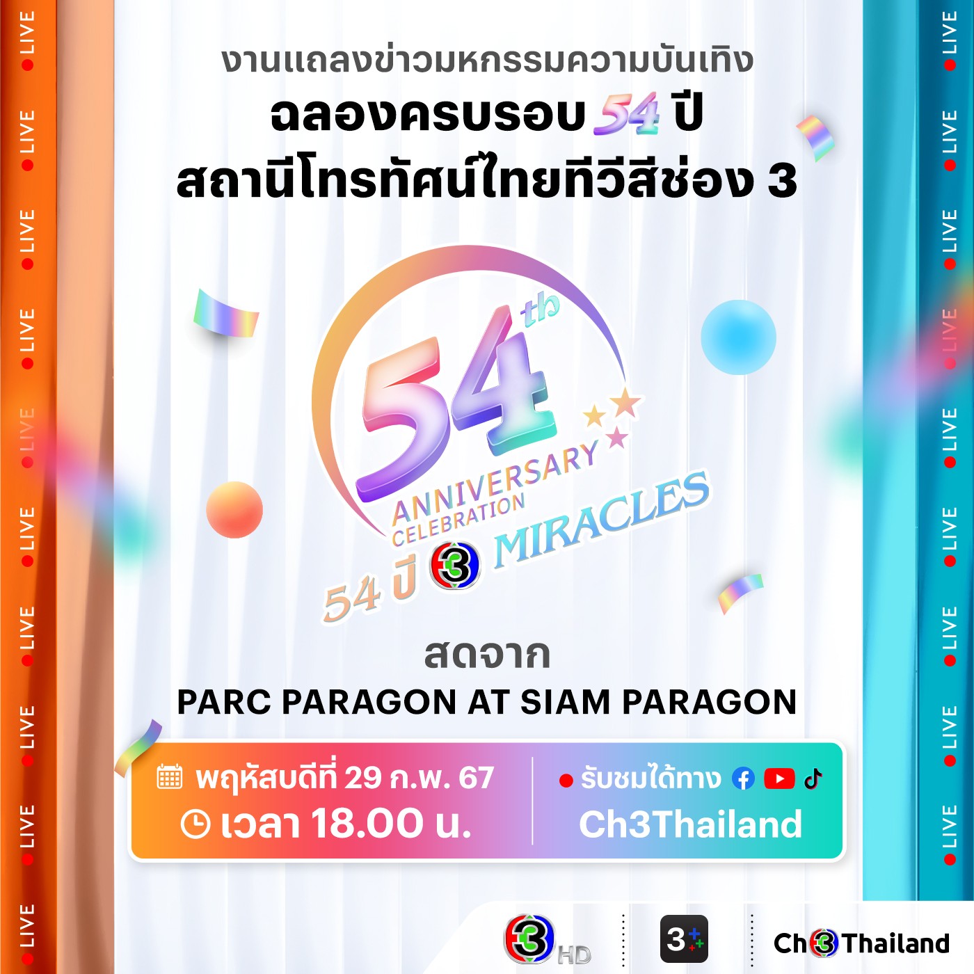 สิ้นสุดการรอคอย งานแถลงข่าวมหกรรมความบันเทิงฉลองครบรอบ 54 ปี สถานีโทรทัศน์ไทยทีวีสีช่อง 3 วันที่ 29 กุมภาพันธ์นี้ ชม Live ได้ทาง Facebook, YouTube, TikTok: Ch3Thailand ตั้งแต่เวลา 18.00 น. เป็นต้นไป