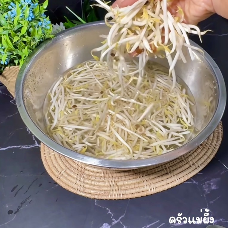 ผสมน้ำด้วยน้ำส้มสายชูเล็กน้อย นำถั่วงอกที่ล้างเสร็จแล้วลงไปแช่ทิ้งไว้