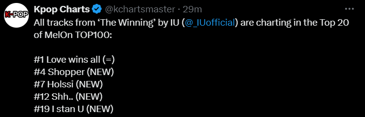 โดยที่ตอนนี้พี่ลี่มี 3 เพลงอยู่ Top 10 ของ MelOn Top100 และทุกเพลงอยู่ใน Top20