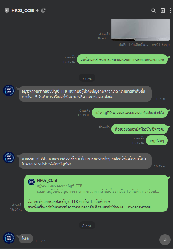เราต้องตามเรื่องต่อที่ กองบังคับการตรวจสอบและวิเคราะห์อาชญากรรมทางเทคโนโลยี เราติดต่อ 1441 เค้าให้เราแอดไลน์ไป เพื่อตามเรื่อง (6 ก.พ. 2567)