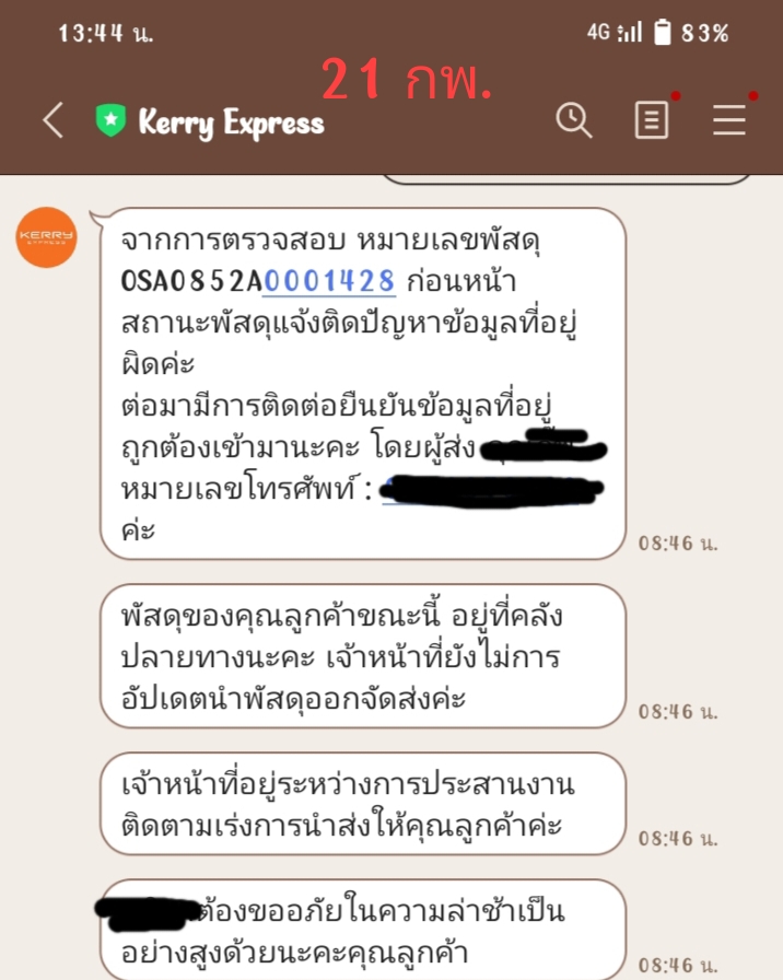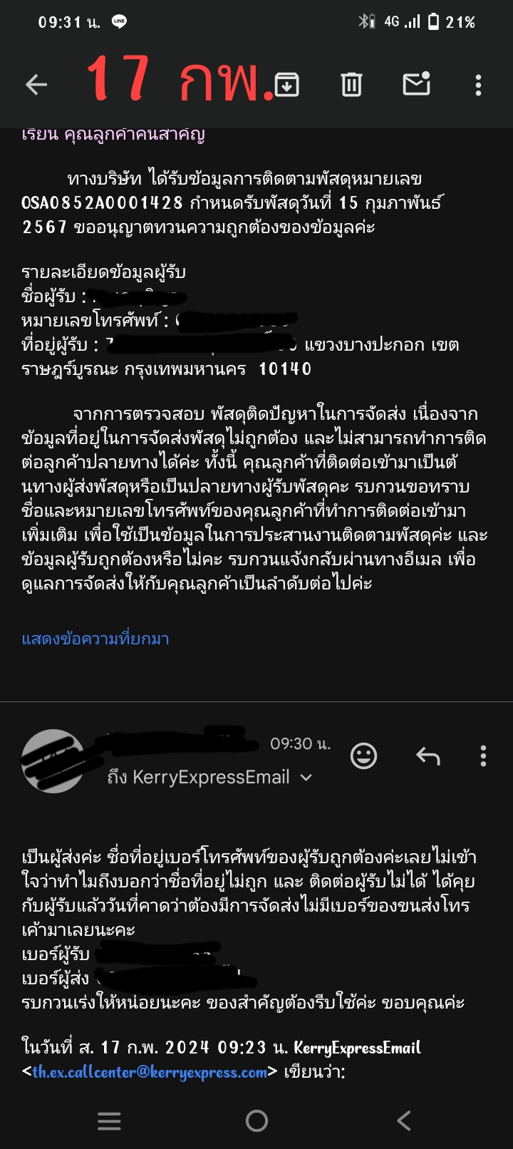 Kerry สถานะค้าง 1 เดือน Call center ติดต่อไม่ได้ ไม่มีความคืบหน้า