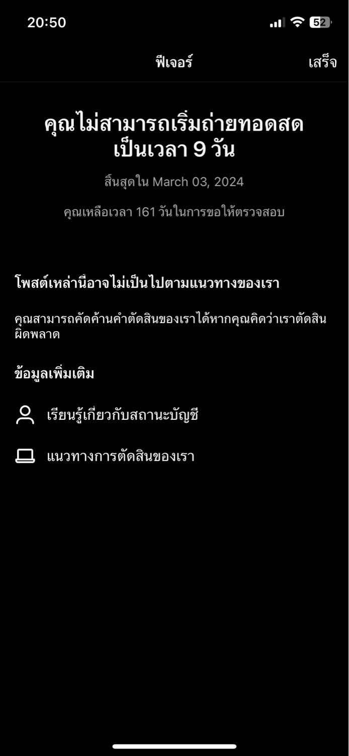 คือเราส่งคลิปกับลงสตอรี่ พิมพ์คำว่า ฆ่-า กับส่งคลิปอนาจทรจนโดนระงับ 180 วัน เครียดมากๆ อยากเล่นไอจี ยืนอุทรณ์ไปแล้ว เลยลองสร้าง บัญชีใหม่ สร้างไป 2 บัญชี โดนแบนหมดเลย เฟสเราก็เชื่อมไอจีไว้ เลยหายเหมือ