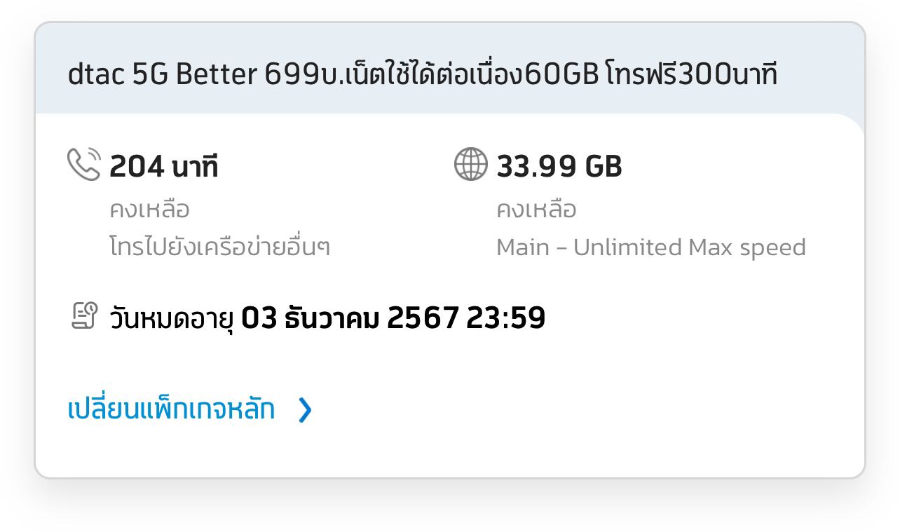 ปัจจุบันใช้แพ็ค 5G Max speed 349 บ./เดือน ซึ่ง ให้อินเตอร์เน็ตมา 5 GB หมดไวมาก ส่วน โทร 150 นาที แทบจะไม่ได้ใช้ ไปหา package ใหม่ในแอพพลิเคชั่น MyAIS ก็เจออันที่ไม่ค่อยอยากได้ เพิ่มราคาเป็น 399 449 หร