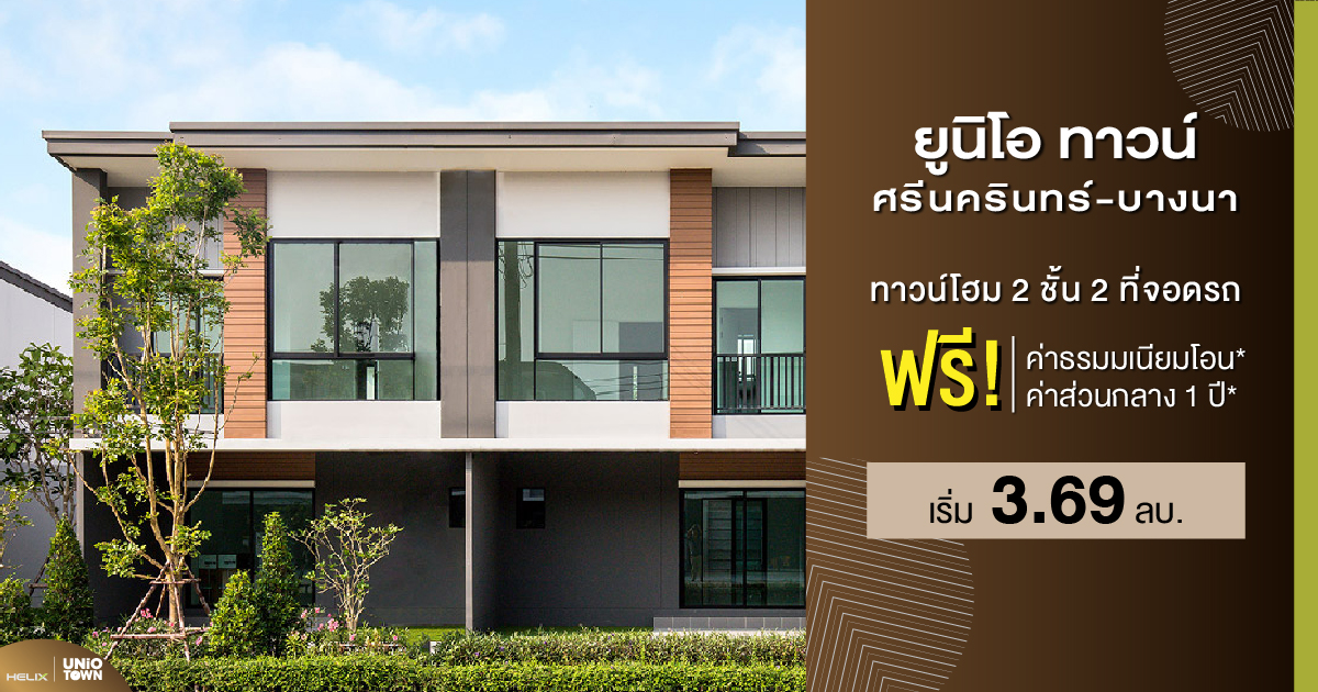 ยูนิโอทาวน์ ( UNio TOWN ) ศรีนครินทร์-บางนา ทาวน์โฮมคนรุ่นใหม่ ที่ชื่นชอบความเป็นส่วนตัว เพียบพร้อมด้วยพื้นที่ใช้สอยที่คุ้มค่า พื้นที่ส่วนกลางครบครัน รวมถึงพื้นที่สีเขียวขนาดใหญ่ใกล้ชิดธรรมชาติ ใกล้รถไฟฟ้าสายสีเหลือง MRT สถานีศรีแบริ่ง เริ่มต้น 3.69 ล้านบาท