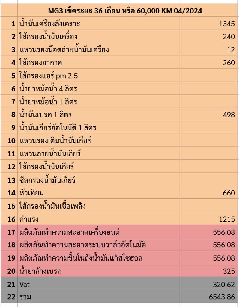 เช็คระยะ ตามรอบ 36 เดือน 60,000 KM ถ้าเอาไปเช็คที่ศูนย์ MG จากที่ลองคำนวนคร่าวๆ ตกอยู่ประมาณ 6543 บาท