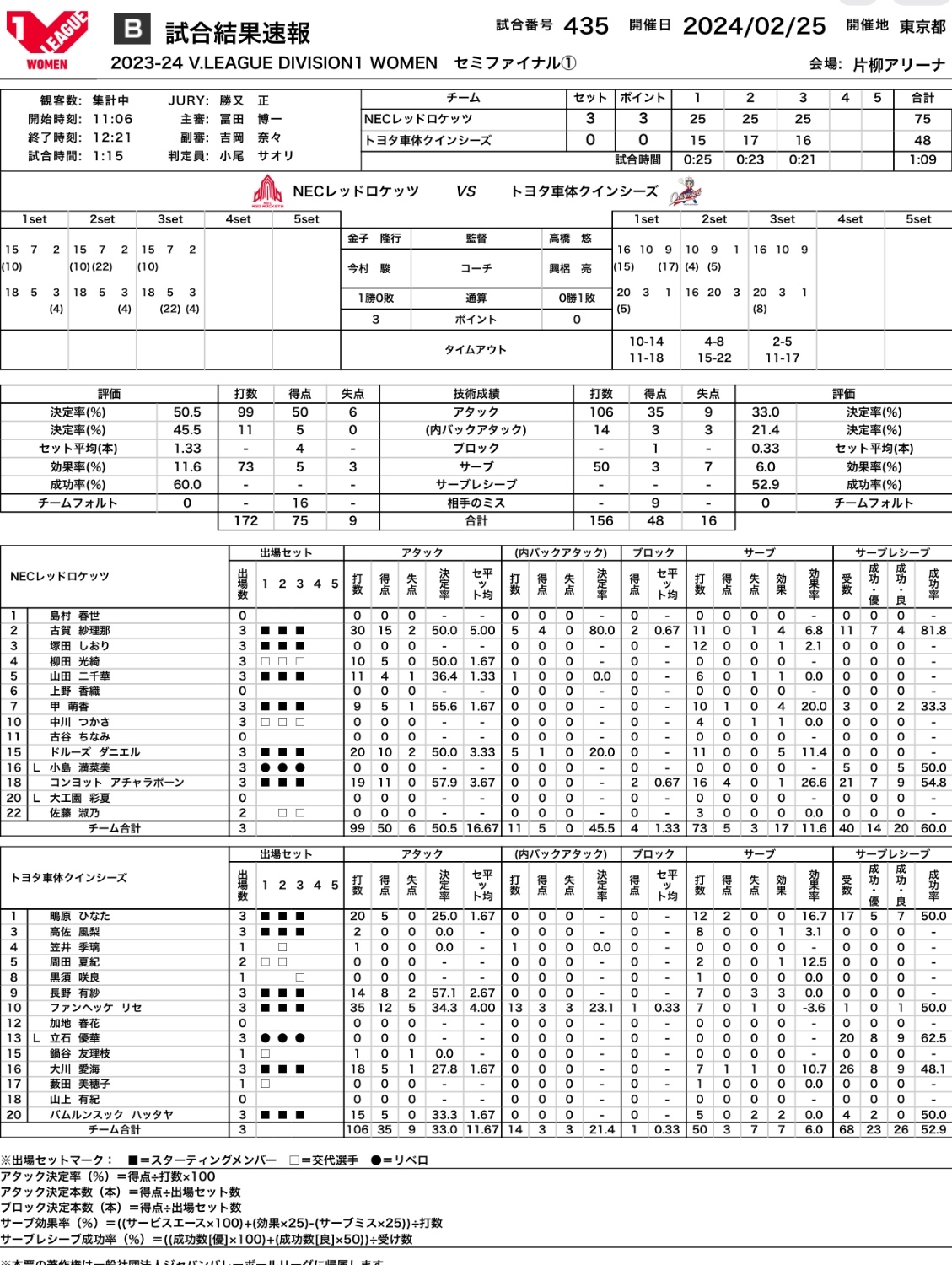 NEC ชนะ JT 3-1 เซต ( 27-25, 32-30, 16-25, 25-17 ) สาว NEC โดนนำก่อนแต่ไล่ปาดได้ในเซต 1-2 แต่เกิดอะไรขึ้นในเซต 3 ถึงโดนสาว JT ทุบกลับ เซต 4 สาว NEC กลับมาทุบได้ยังไง ควีนเพียว มาดามนิชิดะ สาวด