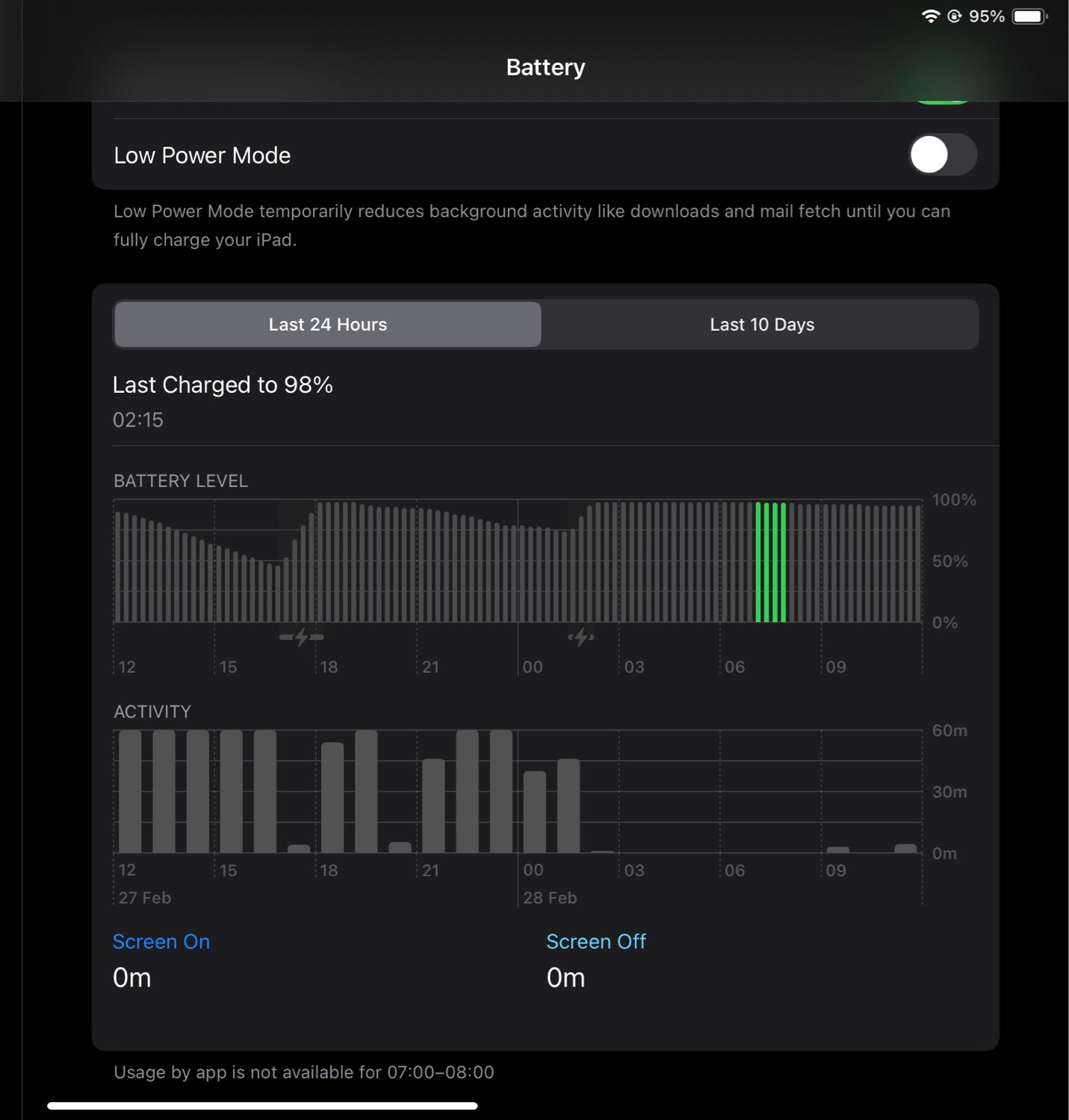 คือเมื่อคืนนี้เราชาร์จไอเเพดไว้เสร็จตอนประมาณ ตี 1:18 สรุปว่าตื่นเช้ามาจากเเบต 98 เปอ เหลือ 96 ทั้งๆที่ยังไม่ได้ใช้งานมาก่อน เเบตไม่ได้เสื่อม ก่อนหน้านี้ก็ไม่เคยเป็นเเบบนี้ เลยอยากทราบว่ามีใครเป็นเหมือนกันมั้ยคะ อยากรู้ว่ามันต้องเเก้ยังไง เราไม่ได้เปิด บลูทูธ เปิดเเสง เปิดการเเจ้งเตือนค้างไว้ แล้วก็ปิด Background App Refresh ไปด้วยเเล้วค่ะ เพิ่งซื้อมา 2 เดือนเองด้วย อันนี้ไอเเพดเจน 10 ค่ะ อ๋าเเล้วก็มีข้อมูลเเบตเตอรี่ด้วยค่ะตามภาพเลยว่ามันลดโดยไม่มีสาเหตุจริงๆ