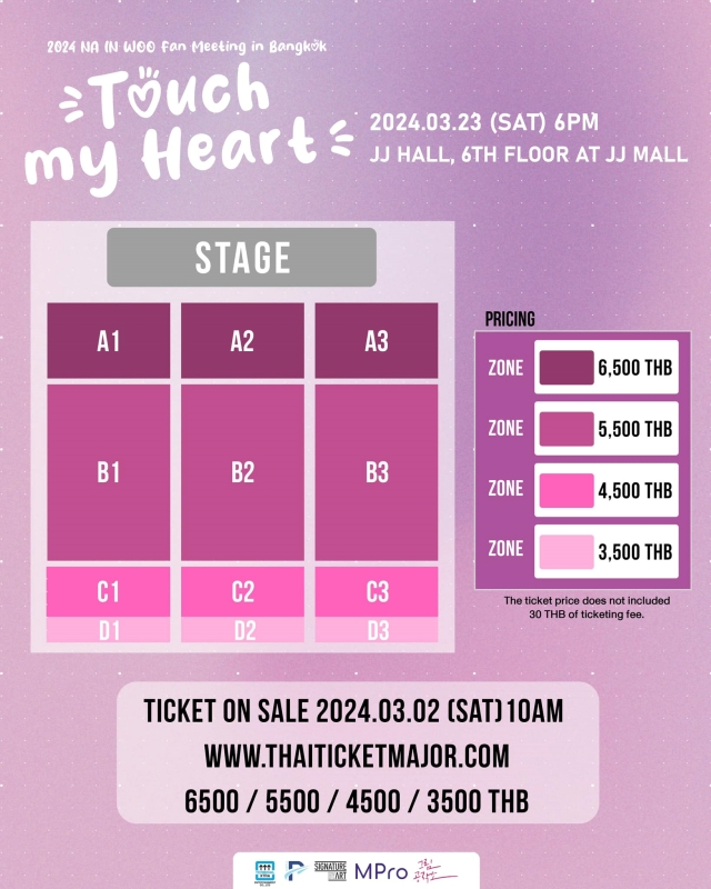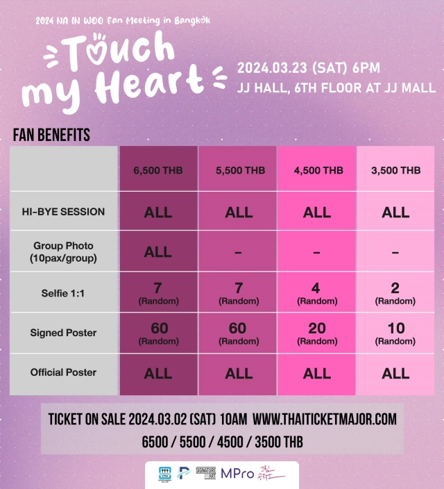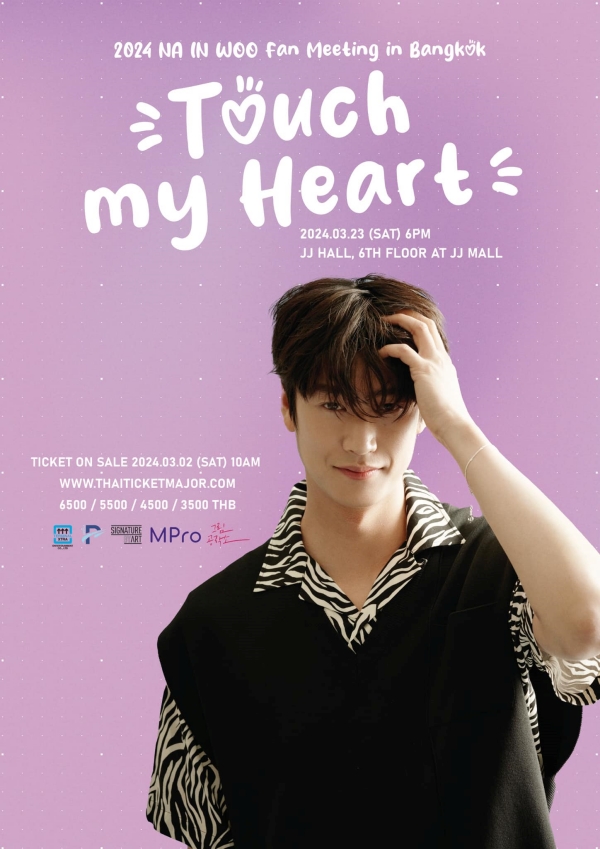 2024 NA IN WOO Fanmeeting IN BANGKOK “Touch my heart” วันที่ 23 มีนาคม 2567 ที่ JJ Hall ชั้น 6, JJ Mall จำหน่ายบัตรวันที่ 2 มีนาคม 2567 บัตรราคา 6500, 5500, 4500 และ 3500 บาท ทาง Thaiticket Major พร้อมรับสิทธิพิเศษ อาทิ HI BYE, SELFIE PHOTO, GROUP PHOTO และ SIGNED POSTER