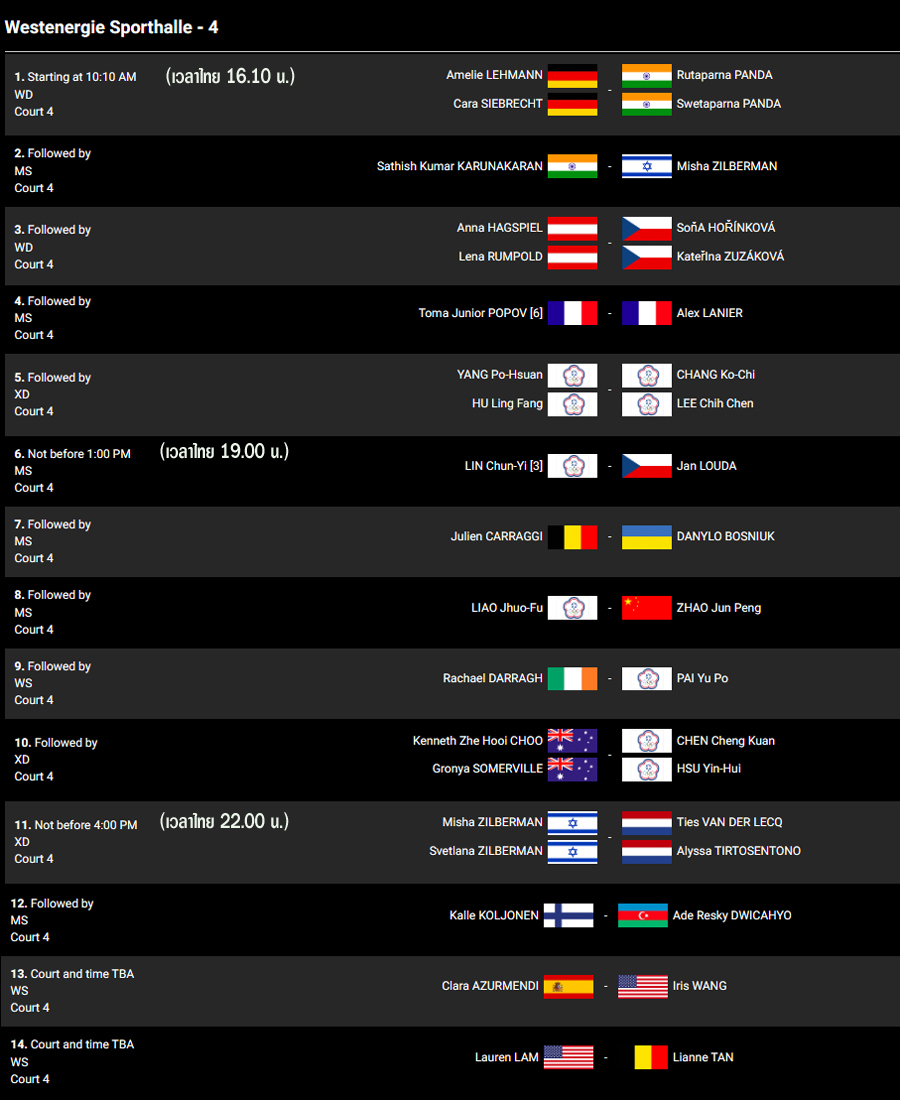 • Youtube BWF TV [Court 4] (คู่แรก 16.10 น.) :