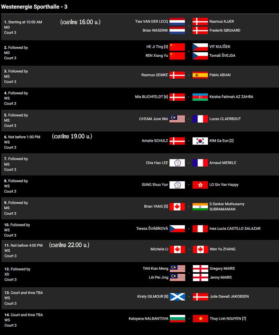 • Youtube BWF TV [Court 3] (คู่แรก 16.00 น.) :
