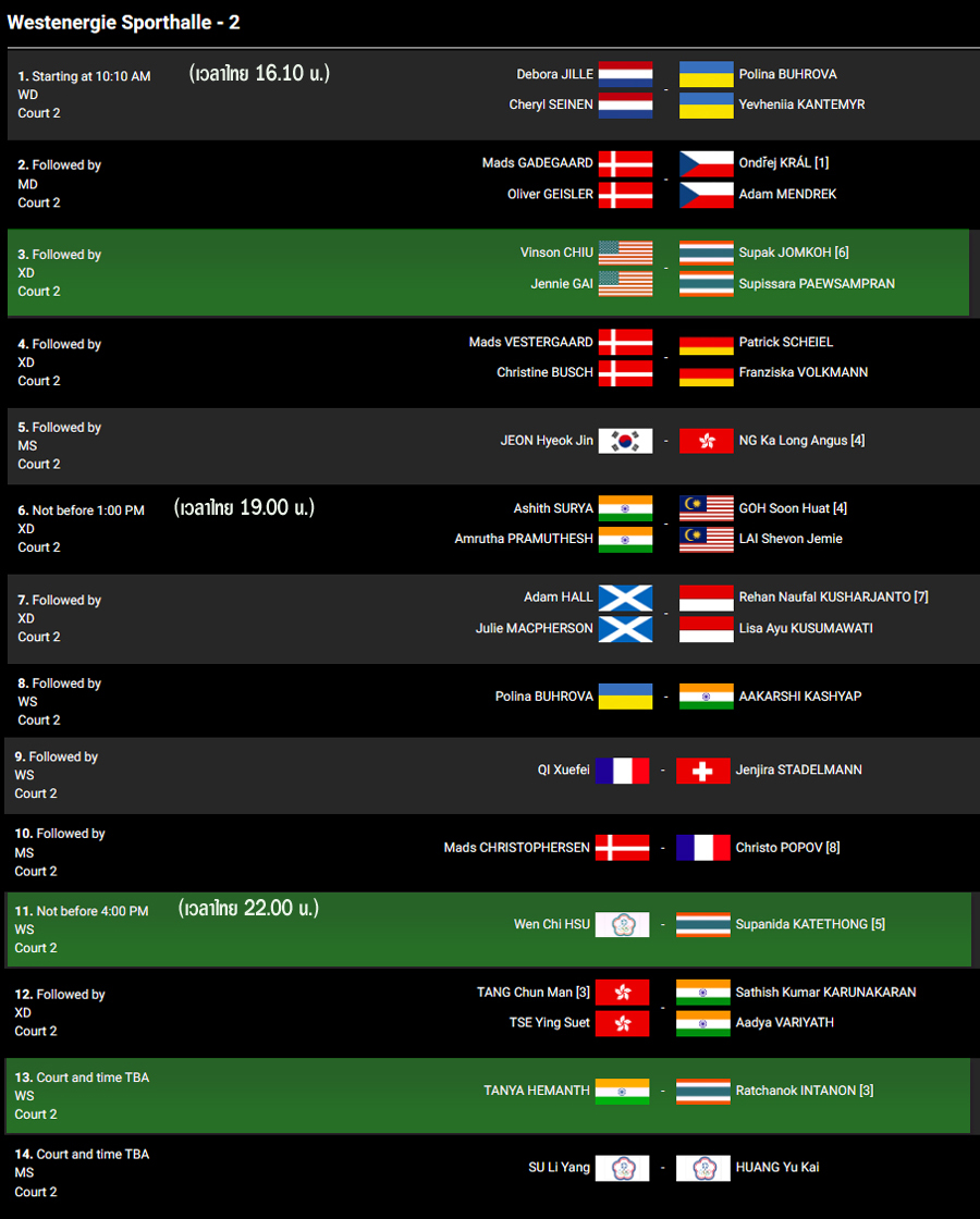 • Youtube BWF TV [Court 2] (คู่แรก 16.10 น.) :