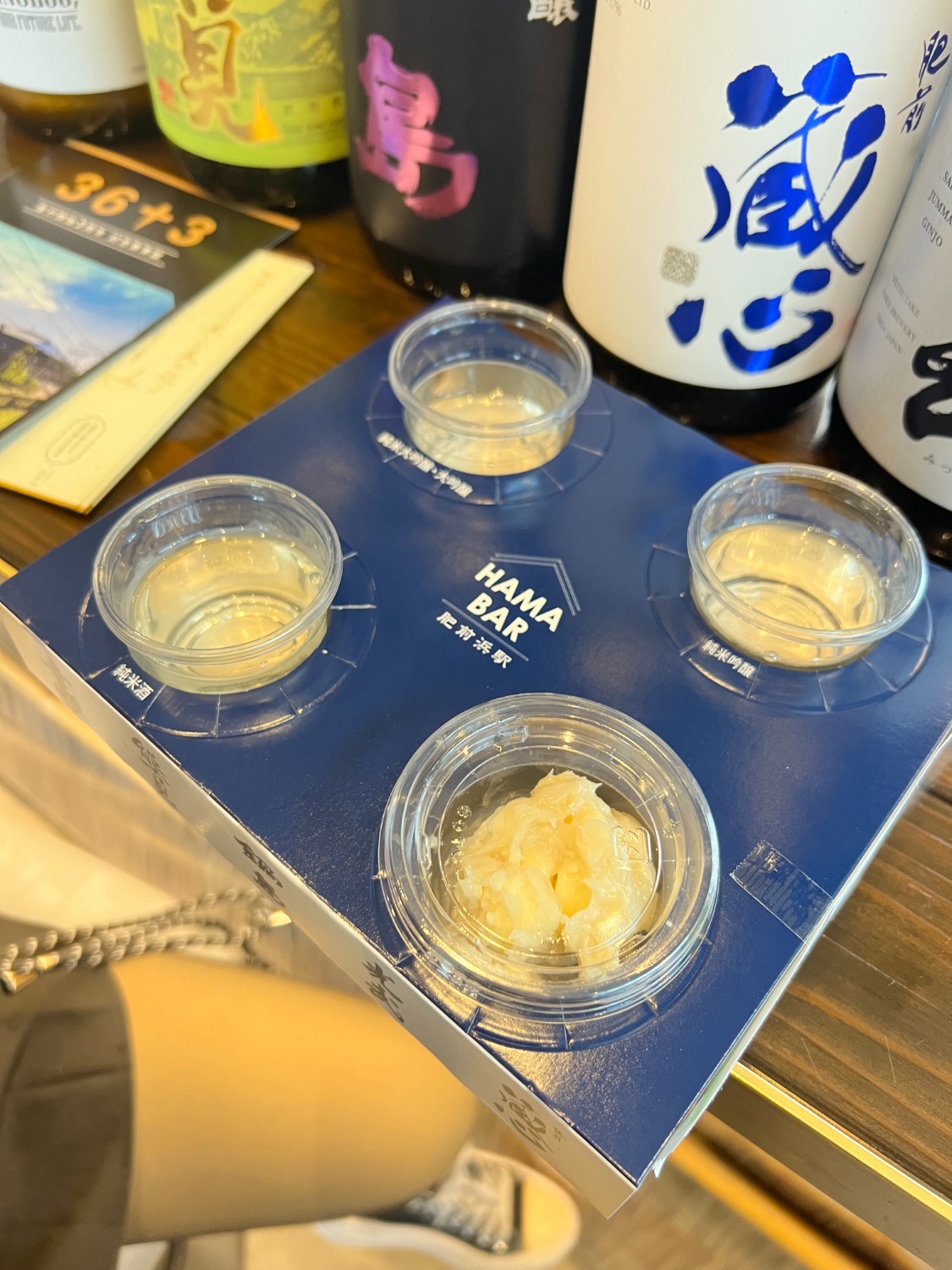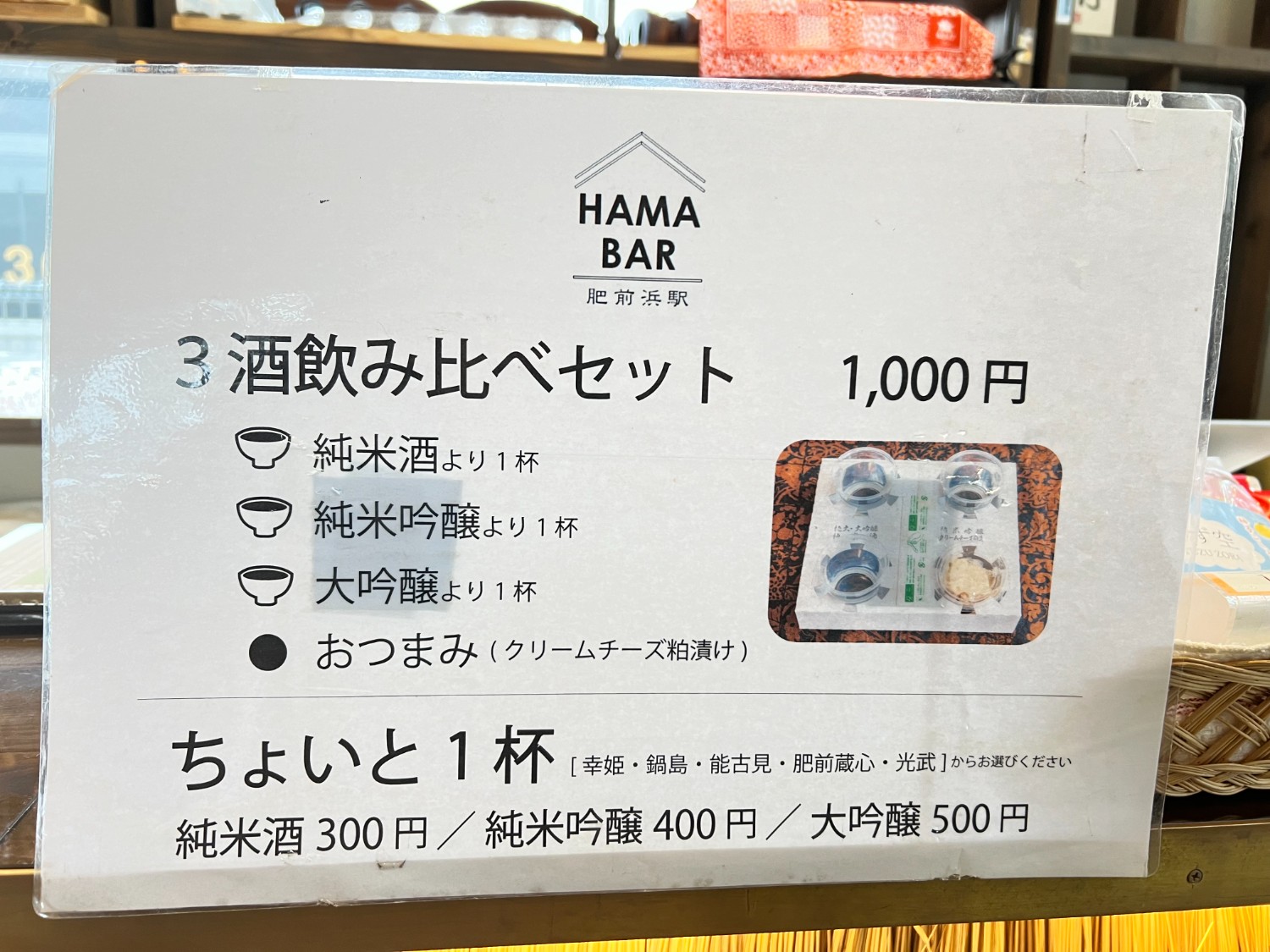 บาร์ชิมสาเกท้องถื่นของเมืองคาชิมะ ได้บรรยากาศสงบสบายและดื่มดํ่ากับสาเกเซ็ตพรีเมี่ยมของเมืองมาดื่มเปรียบเทียบได้รวม3แก้ว มานั่งดื่มพร้อมกับแกล้มที่เป็นชึสดองกับข้าวจากการหมักสาเก อร่อยเกินเพลิดเพลินมาก