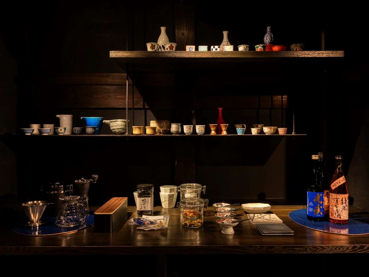 ชั้น 1 เมื่อเราเปิดประตูเข้ามา จะเป็นห้องนั่งเล่นที่สามารถเลือกดื่มสาเกและนํ้าขวดได้ฟรีไม่อั้นในตู้แช่เย็น ส่งตรงมาจากโรงผลิดสาเกพื้นเมือง แถมกับแกล้มไว้ทานคู่กับสาเกและแก้วจานสวยงามให้คุณหยิบใช้ได้ตามสะดวก