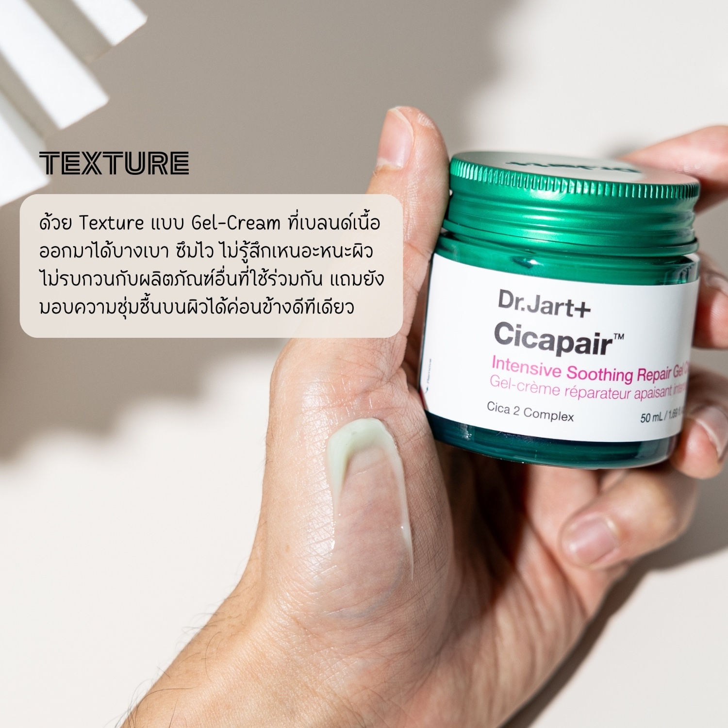 Dr.Jart+ Intensive Soothing Repair Gel Cream เป็นมอยส์เจอร์ไรเซอร์ที่น่าสนใจมากด้วยเนื้อสัมผัสที่บางเบาแต่ให้ความชุ่มชื้นได้เพียงพอ สามารถใช้ได้กับทุกสภาพผิว สารแอคทีฟอย่าง CICA 2 COMPLEX ก็ใส่มาในความเข้มข้นที่มากที่สุดแล้วในไลน์