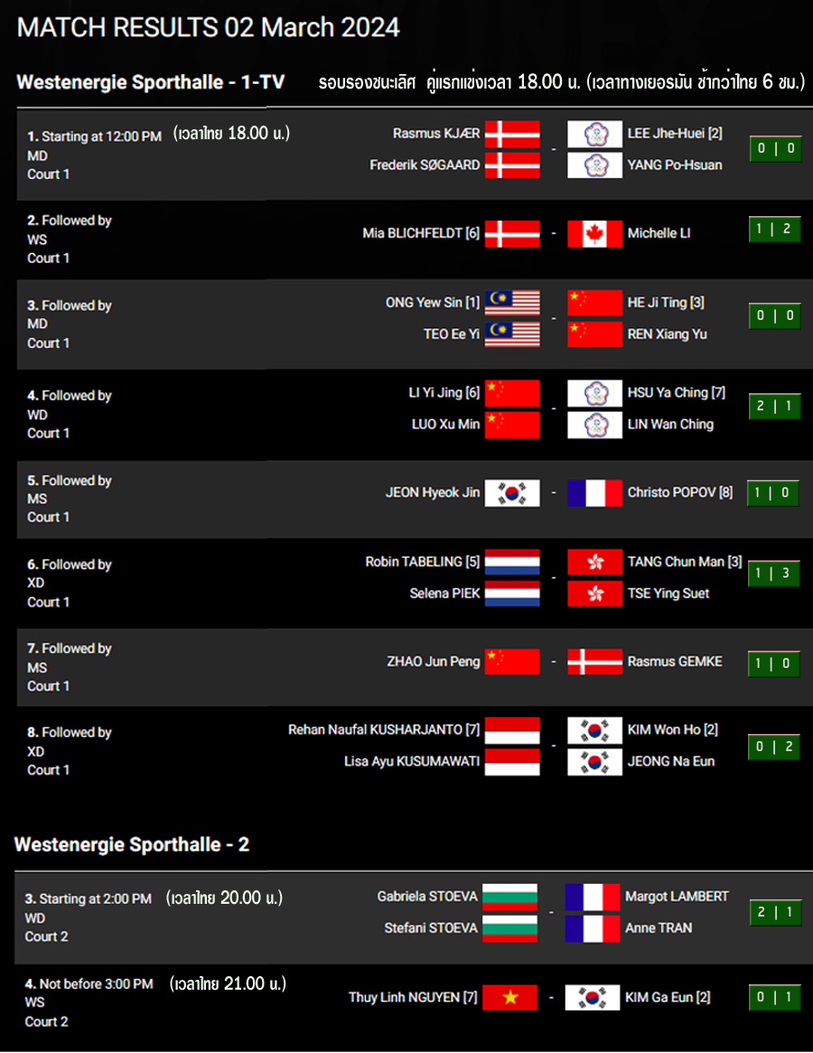 • ถ่ายทอดสด TV Court 1 จำนวน 8 แมทช์ ทาง True Sport 7/SPOTV เวลา 18.00 - 02.00 น. (เช้า 3 มี.ค. 67)