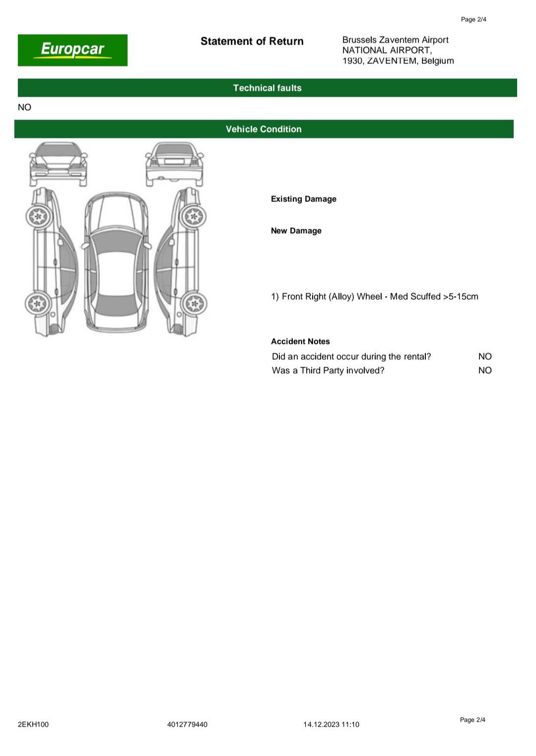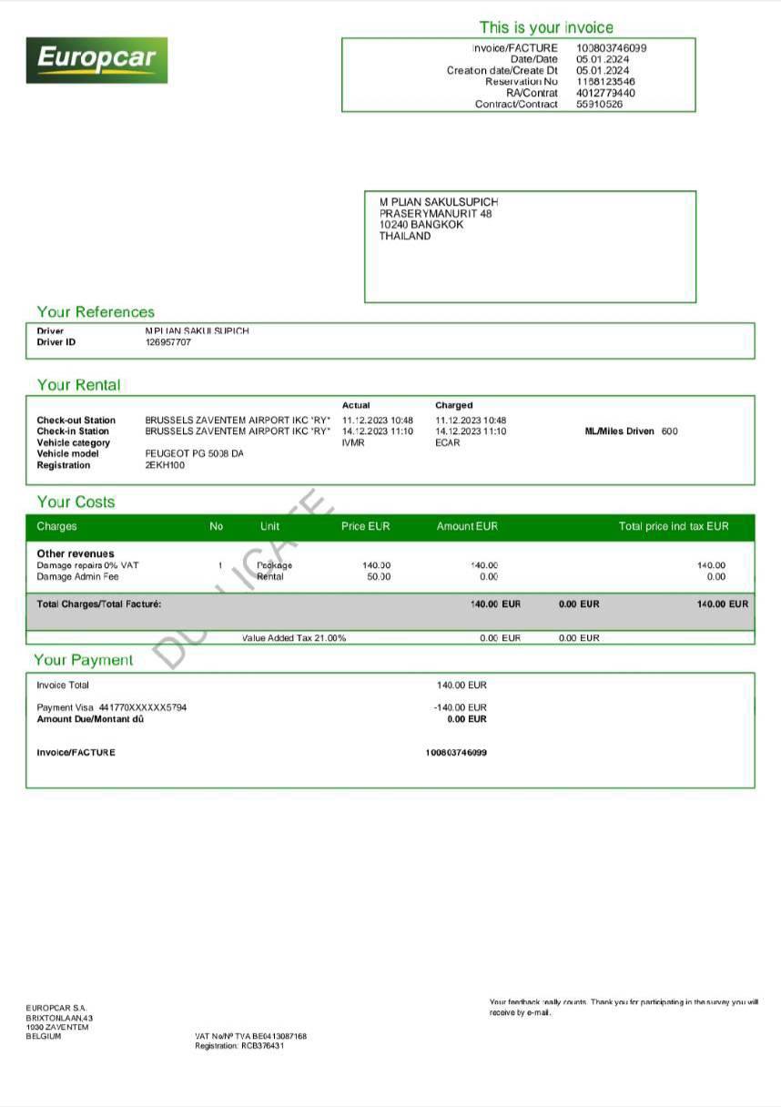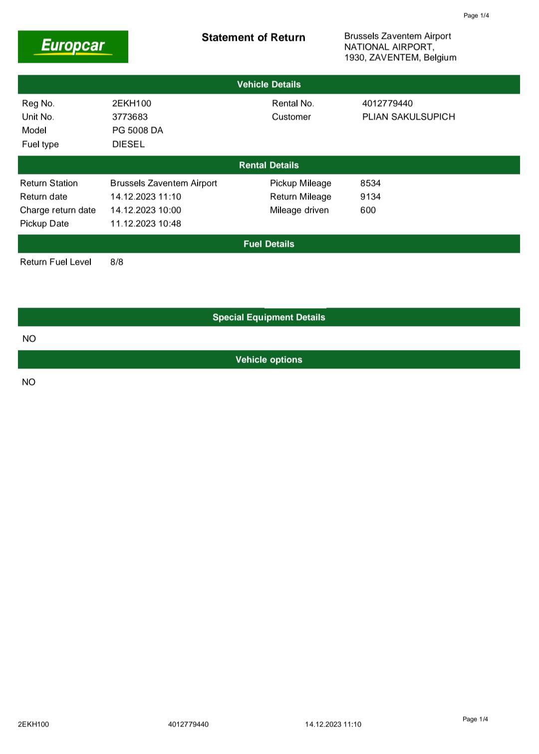 ผมเช่ารถที่บรัสเซลส์ เบลเยี่ยม รับรถช่วงเช้าวันที่ 11 นัดส่งคืนช่วงเช้าวันที่ 14 ธันวาคม แต่เอารถไปคืนวันที่ 13 ธันวาคม ช่วงบ่าย โดยหย่อนกุญแจลงในตู้หน้าสำนักงานซึ่งปิดประตู ไม่มีเจ้าหน้าที่ทำงานอยู่ภายใน