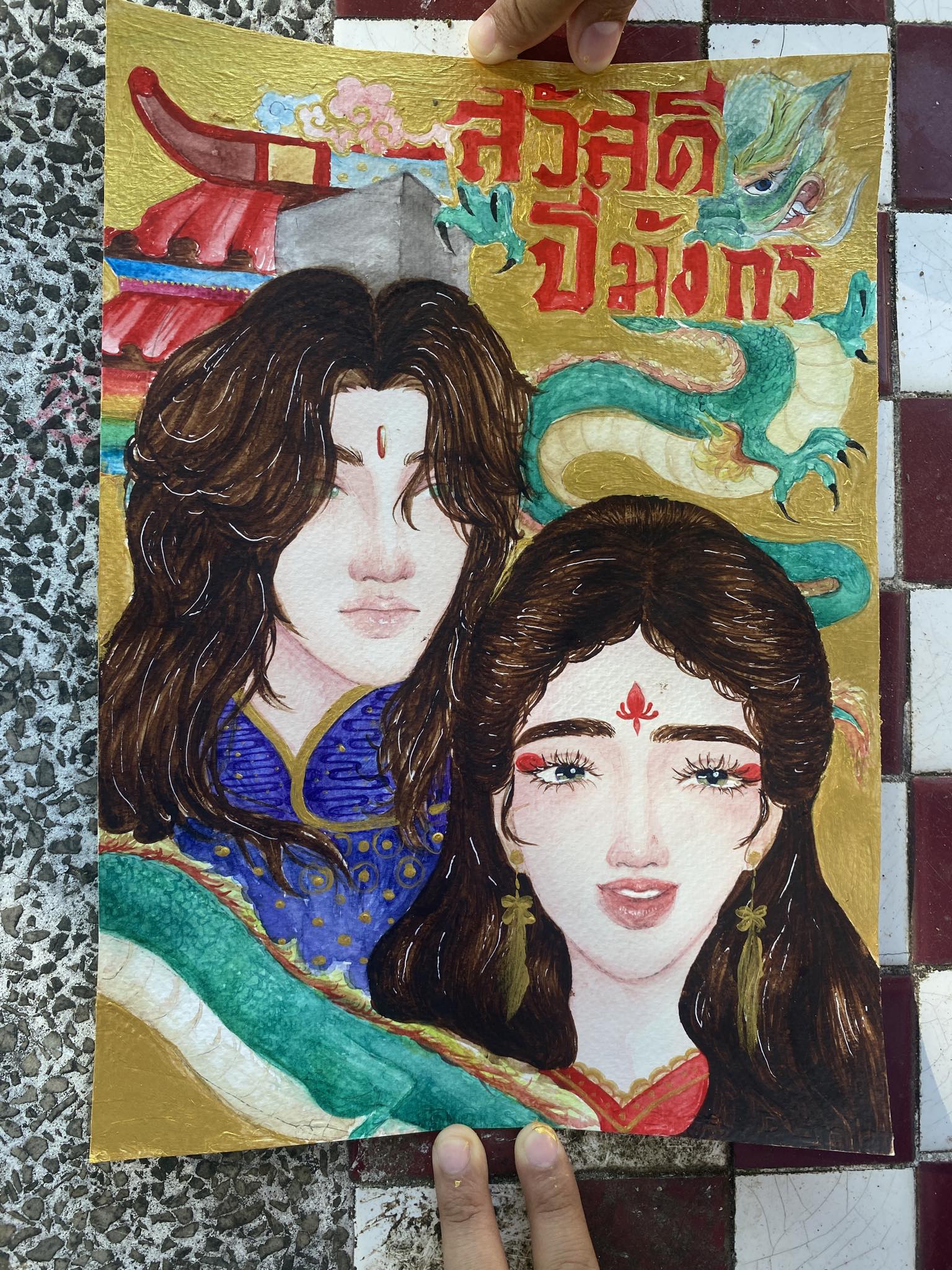 ภาพนี้ใช้สีน้ำลงภาพบุคคลแล้วใช้สีโปสเตอร์ลงพื้นหลังค่ะ