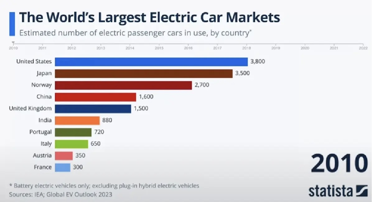 แต่เวลาผ่านไปเพียง 12 ปีจีนขึ้นแท่นเป็นผู้ผลิตรถยนต์อีวีมากที่สุดในโลกที่ 11 ล้านคัน ตามมาด้วยสหรัฐ 2.1 ล้านคัน เยอรมนี 1 ล้านคัน ฝรั่งเศส 6.2 แสนคัน และนอร์เวย์ 5.9 แสนคัน