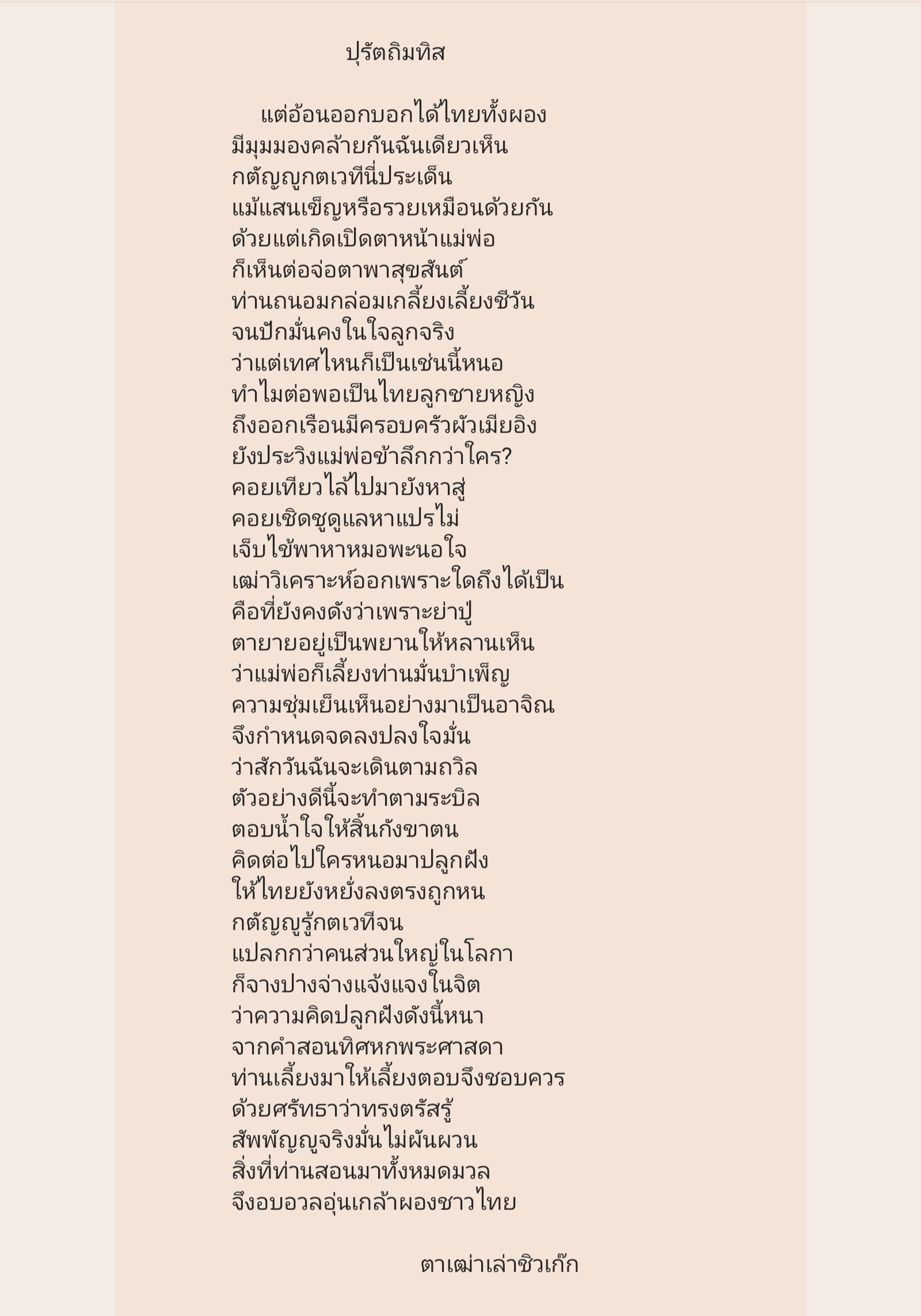 แต้มสีลงตรงที่ต่างสีสันใช้พู่กันวาดค่าภาษาสีแล้วดัดแปลงแต่งรสบทกวีระบายสีโลกทัศน์และศรัทธา"สีความสุขคือสีที่สดใสสำเริงใจรวยรื่นบนผืนผ้าแม้นจมทุกข์เจ็บช้ำสีน้ำตาเปียกผืนผ้าชำรุดหยุดระบาย"&quo