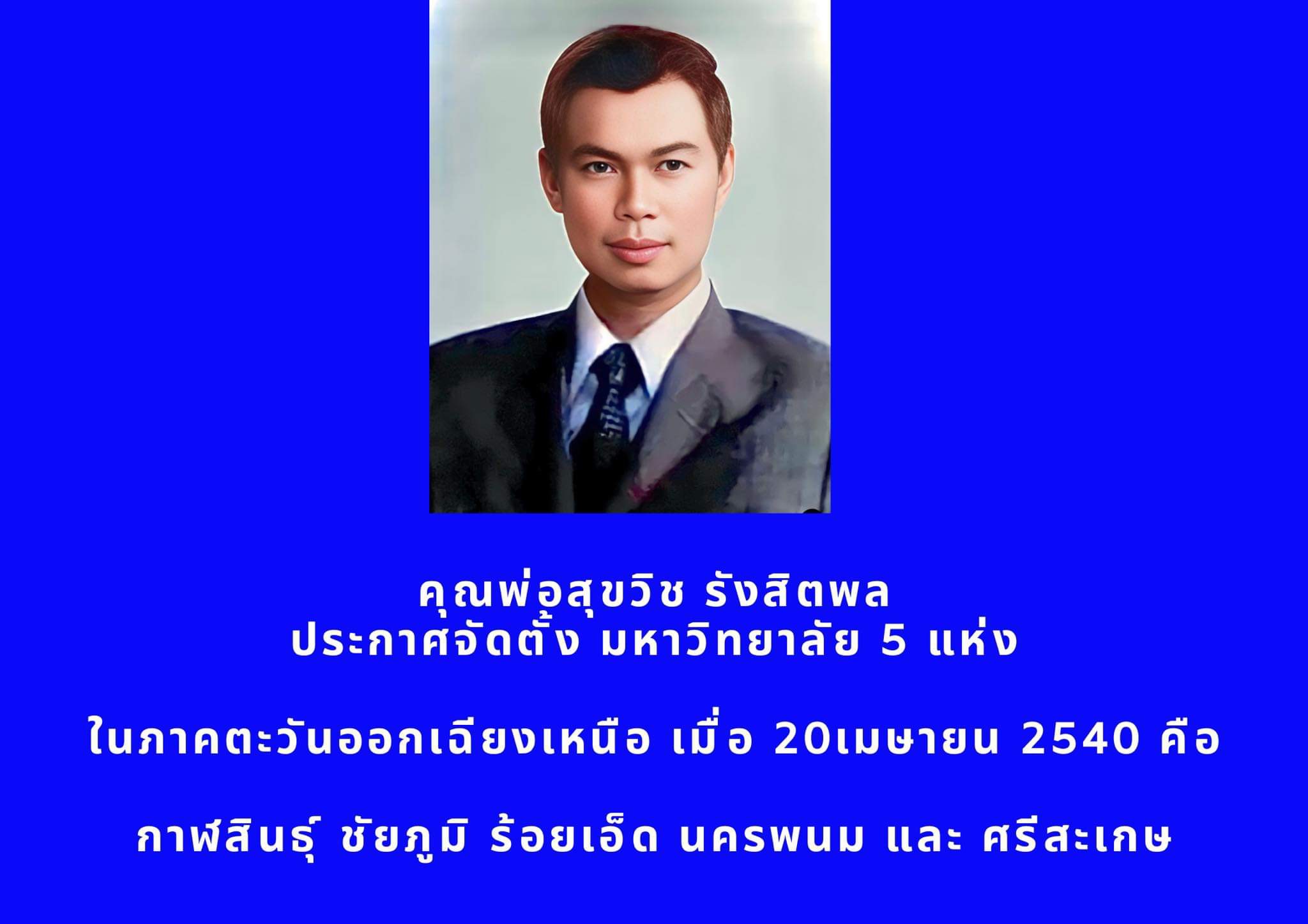 คุณพ่อสุขวิช รังสิตพลก่อตั้งมหาวิทยาลัย 5 แห่งในภาคอีสาน เพื่อสร้างคน แก้จน ด้วยการศึกษา เมื่อ 20 เมษายน 2540