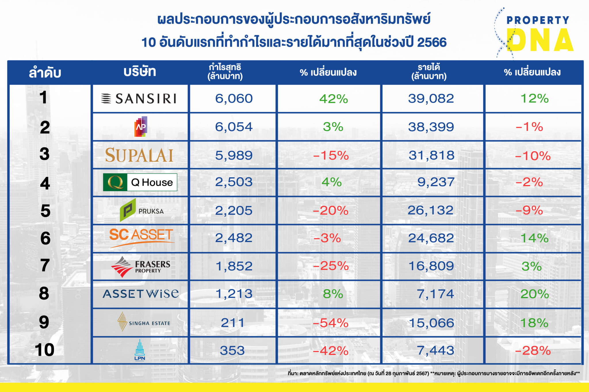 ตามข้อมูลพบว่าแสนสิริเป็นผู้ประกอบการที่มีกำไรในปี 2566 มากที่สุด โดยมีกำไร 6,060 ล้านบาทเพิ่มขึ้นประมาณ 42% เมื่อเทียบกับปี 2565 รายได้ของแสนสิริอยู่ที่ 39,082 ล้านบาท เพิ่มขึ้นเฉลี่ย 12% จากปีที่แล้ว