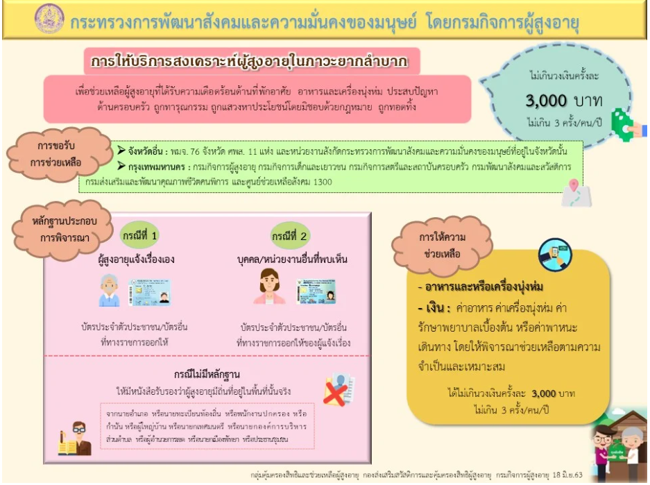 เมื่อวันที่ 4 มี.ค. ผู้สื่อข่าวตรวจสอบกรณี เงินผู้สูงอายุ 3,000 บาท โดยพบข้อมูล กระทรวงการพัฒนาสังคมและความมั่นคงของมนุษย์ โดยกรมกิจการผู้สูงอายุ ระบุว่า การให้บริการสงเคราะห์ผู้สูงอายุในภาวะยากลำบาก เพื่อช่วยเหลือผู้สูงอายุที่ได้รับความเดือดร้อนด้านที่พักอาศัย อาหารและเครื่องนุ่งห่ม ประสบปัญหา ด้านครอบครัว ถูกทารุณกรรม ถูกแสดงหาประโยชน์โดยมิชอบด้วยกฎหมาย ถูกทอดทิ้ง โดยจะได้รับวงเงินครั้งละ 3,000 บาทไม่เกิน 3 ครั้งต่อคนต่อปี