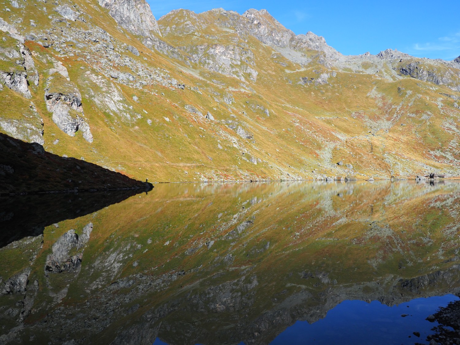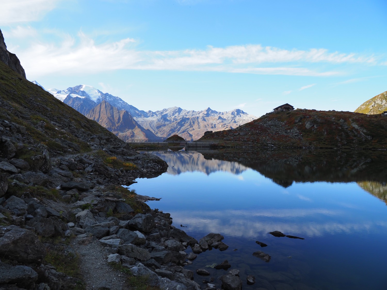 เดินไม่นานก็มาถึง Stellisee เห็นโรงแรม Fluhalp ของเราอยู่ไม่ไกล มียอดเขา Adlerhorn อยู่ด้านหลัง
