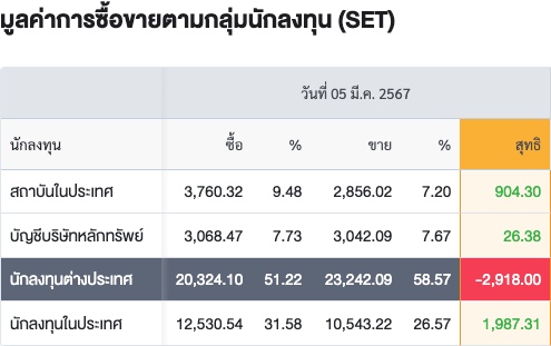 Sinthorn Summary 5/2/2567 : ต่างชาติขายสุทธิ -2,918.00 ลบ.