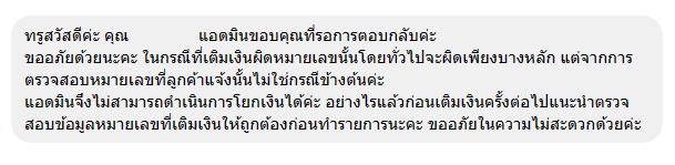 ชำระเงินเสร็จ เงินไม่เข้าไปดูเป็นคนละเบอร์ จริงอยู่ว่ามันก็ความผิดเราที่ไม่เช็ค แต่... เช็คแบบนี้มันมักง่ายไปมั้ยครับ วิธีเช็คที่ควรดูต่อ ควรดูว่าเบอร์ทั้ง2เป็นผู้ลงทะเบียนเป็นคนเดียวกันด้วยก็น่าจะได้อยู่นะครับ ถึงแม้เป็นชื่อผู้ลงทะเบียนชื่อเดียวกันทั้ง2เบอร์ ก็ไม่มีสิทธิ์ขอคืนหรอครับ แล้วไอ้เบอร์ที่เติมผิดก็ไม่ได้ใช้แล้ว ไม่รู้โดนปิดเบอร์ไปหรือยัง หลักฐานเวลาเติมครบแต่ก็ทำอะไรไม่ได้อยู่ดี